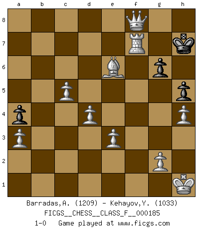 Last move : 1-0 2017 January 29 16:29:57 [Event "FICGS__CHESS__CLASS_F__000185"] [Site "FICGS"] [Date "2016.12.19"] [Round "1"] [White "Barradas,Anderson"] [Black "Kehayov,Yulian"] [Result "1-0"] [WhiteElo "1209"] [BlackElo "1033"] 1.e4 e5 2.Nf3 d6 3.h3 Nf6 4.d3 Be7 5.Nc3 O-O 6.Be2 Nc6 7.a3 d5 8.Bg5 h6 9.Bxf6 Bxf6 10.Nxd5 Be6 11.O-O Bxd5 12.exd5 Ne7 13.c4 c6 14.Rc1 cxd5 15.c5 Rc8 16.b4 b6 17.d4 e4 18.Ne5 Qc7 19.Bg4 Rcd8 20.cxb6 Qxb6 21.Kh1 Nc6 22.Rxc6 Qb8 23.Nd7 Qb7 24.Rd6 Be7 25.Nc5 Qc7 26.Ra6 Bxc5 27.bxc5 g6 28.Be2 Rc8 29.Qb3 Qd7 30.Rd6 Qe7 31.Qxd5 Rfd8 32.Bg4 Rc7 33.Rxd8+ Qxd8 34.Qxd8+ Kg7 35.Qxc7 h5 36.Be6 e3 37.Qxf7+ Kh6 38.fxe3 a5 39.h4 a4 40.Qf8+ Kh7 41.Rf7+ 1-0 Philidor's defense Kingside Castling by player Black (move 5) Kingside Castling by player White (move 11) Player White won this chess game. Follow this game move after move (download)For surely of all the drugs in the world, Chess must be the most permanently pleasurable. (Assiac) Bogoljubow: Matt in vier Zügen! Tartakower: Ich verbitte mir jede Belästigung! (Savielly Grigorievitsch Tartakower) Aquel que ve no otra dirección en el juego que la de dar Jaque Mate a su oponente, nunca será un buen jugador de Ajedrez. (Euwe) Votre seul travail dans les ouvertures est d'obtenir un milieu de partie jouable. (Lajos Portish) If I had no sense of humor, I would long ago have committed suicide. (Mahatma Gandhi)