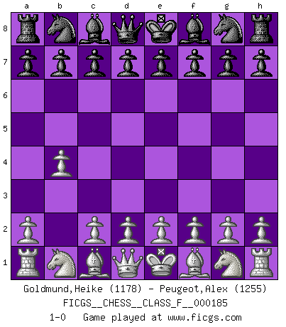 Last move : 1-0 2017 January 29 0:56:51 [Event "FICGS__CHESS__CLASS_F__000185"] [Site "FICGS"] [Date "2016.12.19"] [Round "1"] [White "Goldmund,Heike"] [Black "Peugeot,Alex"] [Result "1-0"] [WhiteElo "1178"] [BlackElo "1255"] 1.b4 1-0 This chess game has been lost on time (started : 2016.12.19 10:55:24) Polish (Sokolsky) opening Player White won this chess game. Follow this game move after move (download)Weak points or holes in the opponent's position must be occupied by pieces not Pawns. (Siegbert Tarrasch) Ich habe Putins Aufstieg an die Macht beobachtet und seine Politik, die demokratischen Institutionen meines Landes zu zerstören. (Garry Kasparov) El Ajedrez es una manera fabulosa para que los niños aprendan a autovalorarse y a autoestimarse. (Saudin Robovic) Les Cavaliers se révèlent fort utiles dans les positions fermées. D'habitude, les Fous sont un peu plus forts que les Cavaliers dans les positions ouvertes. Qu'on le veuille ou non, il restera toujours des exceptions ! Crush them ! Make them suffer ! (General Grievous in Star Wars ep.3)