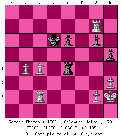 Last move : 1-0 2017 April 2 17:50:15 [Event "FICGS__CHESS__CLASS_F__000185"] [Site "FICGS"] [Date "2016.12.19"] [Round "1"] [White "Rezack,Thomas"] [Black "Goldmund,Heike"] [Result "1-0"] [WhiteElo "1176"] [BlackElo "1178"] 1.e4 d5 2.exd5 Qxd5 3.Nc3 Qa5 4.d4 Nf6 5.Bd2 c6 6.Bd3 Bg4 7.Nf3 e6 8.O-O Nbd7 9.h3 Bh5 10.Qe2 Qc7 11.Rfe1 O-O-O 12.Qe3 Bd6 13.Ne5 Nb6 14.Qg3 Rhg8 15.Bf4 Nbd5 16.Nxd5 Nxd5 17.Bc1 g6 18.c4 Nb4 19.Be4 Bxe5 20.Qxe5 Qxe5 21.dxe5 Rd4 22.b3 Bd1 23.Be3 Rxe4 24.Rexd1 Rxe5 25.Rd2 b6 26.Rad1 c5 27.Rd7 Nxa2 28.Rxa7 Nc3 29.R1d7 Rf8 30.Bh6 Re1+ 31.Kh2 Rd8 32.Rdc7+ Kb8 33.Rcb7+ Kc8 34.Rxb6 Rd7 35.Rc6+ Kd8 36.Bg5+ f6 37.Bxf6+ Ke8 38.Rc8+ Kf7 39.Rxd7+ Kxf6 40.Rxc5 Ne4 41.R5c7 Nxf2 42.Rf7+ Ke5 43.Rxf2 Re3 44.b4 Kd4 45.Rf4+ Ke5 46.R4f7 h5 47.Rf2 Kd6 48.Rg7 Re4 49.Rc2 1-0 Scandinavian (centre counter) defense Kingside Castling by player White (move 8) Queenside Castling by player Black (move 11) Player White won this chess game. Follow this game move after move (download)When you play Bobby, it is not a question if you win or lose. It is a question if you survive. (Boris Spassky) Der Freibauer hat für mich eine Seele, genau wie der Mensch, Wünsche, die unerkannt in ihm schlummern, und Befürchtungen, von deren Existenz er selbst kaum ahnt. (Aaron Nimzowitsch) El Ajedrez es parte de la cultura, y si una cultura esta en decadencia, entonces también el Ajedrez declinará. (Mikhail Botvinnik) Il (Jacob Murray) ne joue pas pour le bon coup, mais pour le meilleur. (Eloi Relange) Life doesn't imitate art, it imitates bad television. (Woody Allen)