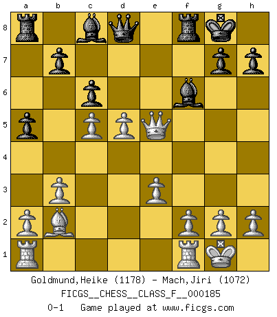 Last move : 0-1 2017 April 30 11:38:7 [Event "FICGS__CHESS__CLASS_F__000185"] [Site "FICGS"] [Date "2016.12.19"] [Round "1"] [White "Goldmund,Heike"] [Black "Mach,Jiri"] [Result "0-1"] [WhiteElo "1178"] [BlackElo "1072"] 1.d4 f5 2.Nf3 Nf6 3.e3 e6 4.Bd3 d5 5.O-O Bd6 6.c4 c6 7.b3 O-O 8.Bb2 Ne4 9.Nbd2 Nd7 10.c5 Be7 11.Qc2 a5 12.Nxe4 dxe4 13.Bxe4 fxe4 14.Qxe4 e5 15.Nxe5 Nxe5 16.Qxe5 Bg5 17.d5 Bf6 0-1 Dutch Kingside Castling by player White (move 5) Kingside Castling by player Black (move 7) Player Black won this chess game. Follow this game move after move (download)Chess is so inspiring that I do not believe a good player is capable of having an evil thought during the game. (Wilhelm Steinitz) Kleine Schachspieler machen Mist, und große Schachspieler machen Mist, aber große machen weniger Mist. (Fritz Sämisch) La maestría del Ajedrez consiste esencialmente en analizar posiciónes de Ajedrez con precisión. (Mikhail Botvinnik) Un millionnaire : 'Monsieur Steinitz ! Vous ne participez aux tournois que pour l'argent, alors que moi je n'y viens que pour l'honneur.' Steinitz : 'Chacun joue pour ce qu'il n'a pas'... Whenever people agree with me, I always feel I must be wrong. (Oscar Wilde)