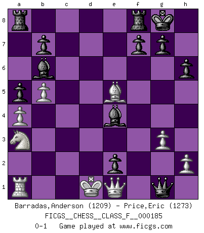 Last move : 0-1 2017 January 7 18:41:18 [Event "FICGS__CHESS__CLASS_F__000185"] [Site "FICGS"] [Date "2016.12.19"] [Round "1"] [White "Barradas,Anderson"] [Black "Price,Eric"] [Result "0-1"] [WhiteElo "1209"] [BlackElo "1273"] 1.e4 e5 2.Nf3 Nc6 3.d4 exd4 4.Nxd4 Bc5 5.Be3 Qf6 6.c3 Nge7 7.b4 Bb6 8.a4 a5 9.b5 Ne5 10.Na3 d5 11.Qc2 c5 12.Nf5 Nxf5 13.exf5 Bxf5 14.Qd2 h6 15.Be2 O-O 16.g3 Be4 17.Rg1 d4 18.cxd4 cxd4 19.Bf4 d3 20.Bxe5 Qxf2+ 21.Kd1 Qxg1+ 22.Qe1 dxe2+ 0-1 Scotch game Kingside Castling by player Black (move 15) Player Black won this chess game. Follow this game move after move (download)Chess is a more highly symbolic game, but the aggressions are therefore even more frankly represented in the play. It probably began as a war game; that is, the representation of a miniature battle between the forces of two kingdoms. (Karl Meninger) Kostenjuk hat keinen Sexappeal. (Loek van Wely) Hasta este punto, las blancas han seguido un análisis bien conocido. Pero ahora el hace un error fatal: empieza a usar su propia cabeza. (Siegbert Tarrasch) Les échecs sont plus proches de l'art de l'assassinat que de l'art de la guerre. (Arturo Perez-Reverte) Life is pain my dear and anyone who says otherwise is selling something. (Princess Bride)