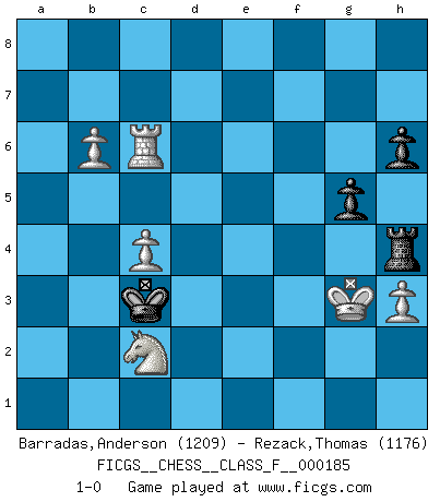Last move : 1-0 2017 March 3 11:31:7 [Event "FICGS__CHESS__CLASS_F__000185"] [Site "FICGS"] [Date "2016.12.19"] [Round "1"] [White "Barradas,Anderson"] [Black "Rezack,Thomas"] [Result "1-0"] [WhiteElo "1209"] [BlackElo "1176"] 1.e4 c5 2.Nf3 d6 3.d4 cxd4 4.Nxd4 Nf6 5.Nc3 Nc6 6.Bb5 Bd7 7.O-O Nxd4 8.Bxd7+ Qxd7 9.Qxd4 e6 10.Rd1 Be7 11.Bg5 O-O 12.e5 Ne8 13.Bxe7 Qxe7 14.exd6 Nxd6 15.Qxd6 Qxd6 16.Rxd6 Rfc8 17.Rd7 b6 18.Rc1 h6 19.Nb5 a6 20.Nd6 Rf8 21.a4 Rad8 22.Rxd8 Rxd8 23.Nc4 b5 24.axb5 axb5 25.Ne5 Rd5 26.Nd3 Rd6 27.Nb4 g5 28.h3 Rd4 29.c3 Rd2 30.Rb1 Kg7 31.g4 e5 32.f3 Kg6 33.Nc6 Kf6 34.Nb4 Re2 35.Nd5+ Ke6 36.Nc7+ Kd6 37.Nxb5+ Kc5 38.Na3 e4 39.fxe4 Rxe4 40.b4+ Kd5 41.c4+ Kc6 42.Kf2 f6 43.b5+ Kb6 44.Kf3 Re5 45.Rb4 f5 46.gxf5 Rxf5+ 47.Kg4 Rf6 48.Ra4 Rf4+ 49.Kg3 Rh4 50.Ra6+ Kc5 51.Rc6+ Kb4 52.Nc2+ Kc3 53.b6 1-0 Sicilian Kingside Castling by player White (move 7) Kingside Castling by player Black (move 11) 10 pieces endgame at move 46 : White KRNPPP , Black KRPP WHITE : King + 1 Rook 1 Knight 3 Pawns BLACK : King + 1 Rook 2 Pawns Player White won this chess game. Follow this game move after move (download)If I win a tournament, I win it by myself. I do the playing. Nobody helps me. (Bobby Fischer) Alle offensichtlichen Züge sehen nach dem Spiel in der Analyse verdächtig aus. (Viktor Kortschnoi) Nos gusta pensar. (Gary Kasparov) Il vaut mieux sacrifier les pièces de l'adversaire. (Xavier Tartacover) Children in the dark cause accidents, accidents in the dark cause children. (Unknown)