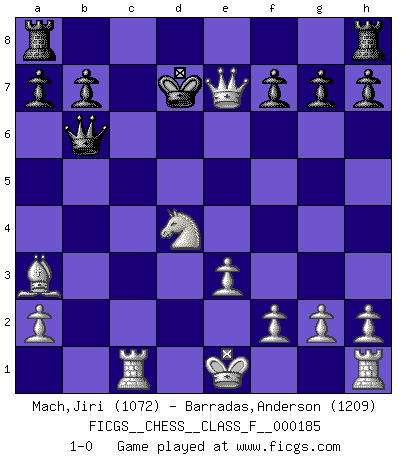 Last move : 1-0 2017 May 5 12:6:25 [Event "FICGS__CHESS__CLASS_F__000185"] [Site "FICGS"] [Date "2016.12.19"] [Round "1"] [White "Mach,Jiri"] [Black "Barradas,Anderson"] [Result "1-0"] [WhiteElo "1072"] [BlackElo "1209"] 1.d4 Nf6 2.c4 e6 3.Nc3 Bb4 4.e3 d5 5.Nf3 Nc6 6.Qc2 Ne4 7.Bd3 Qf6 8.cxd5 Bxc3+ 9.bxc3 exd5 10.c4 Be6 11.cxd5 Bxd5 12.Bxe4 Nxd4 13.Nxd4 c6 14.Bxd5 cxd5 15.Ba3 Qa6 16.Qc5 Qf6 17.Qb5+ Kd8 18.Rc1 Qb6 19.Qxd5+ Ke8 20.Qe5+ Kd7 21.Qe7+ 1-0 Nimzo-Indian : 4.e3 Player White won this chess game. Follow this game move after move (download)Combinations have always been the most intriguing aspect of Chess. The masters look for them, the public applauds them, the critics praise them. It is because combinations are possible that Chess is more than a lifeless mathematical exercise. They are the poetry of the game; they are to Chess what melody is to music. They represent the triumph of mind over matter. (Reuben Fine) Was ist der Unterschied zwischen einem Strassenarbeiter und einem Schachspieler? --Der Schachspieler bewegt sich ab und zu. (Anonymous) La belleza de un movimiento no se refleja solo en su apariencia, sino en el pensamiento detrás de él. (Siegbert Tarrasch) Soyez une menace à chaque fois que vous vous asseyez pour jouer. (Ken Smith) Life is like a play: it's not the length but the excellence of the acting that matters. (Seneca)