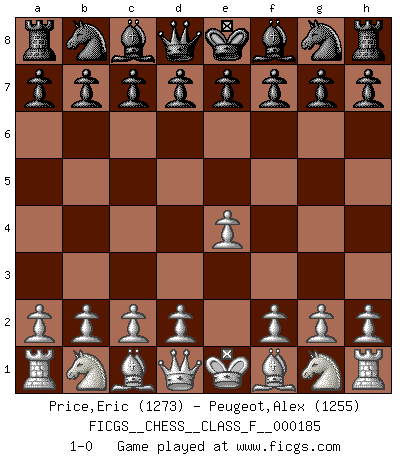 Last move : 1-0 2017 January 30 1:6:44 [Event "FICGS__CHESS__CLASS_F__000185"] [Site "FICGS"] [Date "2016.12.19"] [Round "1"] [White "Price,Eric"] [Black "Peugeot,Alex"] [Result "1-0"] [WhiteElo "1273"] [BlackElo "1255"] 1.e4 1-0 This chess game has been lost on time (started : 2016.12.19 10:55:24) King's pawn Opening Player White won this chess game. Follow this game move after move (download)Though most people love to look at the games of the great attacking masters, some of the most successful players in history have been the quiet positional players. They slowly grind you down by taking away your space, tying up your pieces, and leaving you with virtually nothing to do ! (Yasser Seirawan) Frage des Reporters: -Welche besonderen Umstände rechtfertigen das Anhalten der Uhren während einer Turnierpartie? Antwort: -Einen Fotographen zu strangulieren. (Siegbert Tarrasch) El Ajedrez es en su esencia, un juego. En su forma, un arte. Y en su ejecución, una ciencia. (Baron Tassilo) Les échecs sont un jeu terrible. Si vous n'avez pas le centre, votre adversaire a une position plus libre. Par contre, si vous avez le centre, alors vous avez vraiment quelque chose pour laquelle vous inquiéter ! (Siegbert Tarrasch) He who fights with monsters should be careful lest he thereby become a monster. (Friedrich Nietzsche, Beyond Good and Evil)