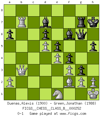 Last move : 0-1 2017 January 4 10:48:45 [Event "FICGS__CHESS__CLASS_B__000252"] [Site "FICGS"] [Date "2016.12.19"] [Round "1"] [White "Duenas,Alexis"] [Black "Green,Jonathan"] [Result "0-1"] [WhiteElo "1900"] [BlackElo "1988"] 1.d4 Nf6 2.c4 g6 3.Nc3 Bg7 4.e4 d6 5.Nf3 O-O 6.Be2 e5 7.O-O Nc6 8.d5 Ne7 9.Ne1 Nd7 10.Be3 f5 11.f3 f4 12.Bf2 g5 13.Rc1 Rf7 14.c5 Nxc5 15.b4 Na6 16.Nb5 Bd7 17.Nxa7 Nxb4 18.Qd2 Na6 19.Bxa6 bxa6 20.Qc2 Nc8 21.Nc6 Qf8 22.Nd3 Bf6 23.Rb1 Ne7 24.Nxe7+ Rxe7 25.Qxc7 Rg7 26.Qc2 h5 27.Kh1 Rc8 28.Qb3 g4 29.Rfc1 Rxc1+ 30.Rxc1 Kh7 31.Rc7 Qe8 32.Rb7 Qg6 33.Ne1 g3 0-1 King's Indian : Orthodox, Aronin-Taimanov variation (Yugoslav attack / Mar del Plata variation) Kingside Castling by player Black (move 5) Kingside Castling by player White (move 7) Player Black won this chess game. Follow this game move after move (download)It was clear to me that the vulnerable point of the American Grandmaster (Bobby Fischer) was in double-edged, hanging, irrational positions, where he often failed to find a win even in a won position. (Efim Geller) Ich trinke, ich rauche, ich spiele, ich liebe Frauen aber Fernschach ist ein Laster, das ich nicht habe. (Mikhail Nekhemyevich Tal) Si un gobernante no entiende al Ajedrez, ¿como puede governar él un reinado?. (El Rey Khusros II) D'abord les bases : Jouez et étudiez, puis étudiez et jouez, ensuite jouez et étudiez, puis étudiez et jouez. Deuxièmement : Donnez toujours le meilleur de vous-même ! (Ken Smith) To err is human, but to really foul things up requires a computer. (Farmer's Almanac, 1978)