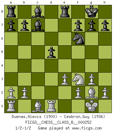 Last move : 1/2-1/2 2017 January 31 1:3:24 [Event "FICGS__CHESS__CLASS_B__000252"] [Site "FICGS"] [Date "2016.12.19"] [Round "1"] [White "Duenas,Alexis"] [Black "Cesbron,Guy"] [Result "1/2-1/2"] [WhiteElo "1900"] [BlackElo "1936"] 1.d4 d5 2.c4 c6 3.Nf3 e6 4.g3 Nf6 5.Bg2 Nbd7 6.Nbd2 Bd6 7.O-O O-O 8.Qc2 Re8 9.Rd1 e5 10.Nxe5 Nxe5 11.dxe5 Bxe5 12.Nf3 Qc7 13.cxd5 cxd5 14.Qxc7 Bxc7 15.e3 1/2-1/2 QGD Slav : 3.Nf3 Kingside Castling by player White (move 7) Kingside Castling by player Black (move 7) This chess game ended in a draw. Follow this game move after move (download)A chess genius has died; a loss for humanity. (Viktor Kortchnoi, about Bobby Fischer's death) In Buenos Aires ist es nicht mein vorrangiges Ziel ein starkes Turnier zu organisieren, sondern ein Turnier für Gentlemen. Ich würde nie Kamsky einladen. Ich mag keine Probleme. (Miguel Najdorf) Las piezas de Ajedrez son los bloques del alfabeto que moldean los pensamientos; y esos pensamientos, aunque hagan un diseño visual en el tablero, expresan abstractamente su belleza como un poema. (Marcel Duchamp) La tactique, c'est ce que vous faites quand il y a quelque chose à faire; la stratégie, c'est ce que vous faites quand il n'y a rien à faire. (Savielli Tartacower) I couldn't make any sense out of what this particular thread is about. It sounds like R2 D2 computer speaking. A space fight ?!? Some 'command' problems in Moscow ? Some killers & narcotic addicts attacking some game & a god wannabe ?? (Dinesh De Silva, lost in a russian conflict in FICGS forum)