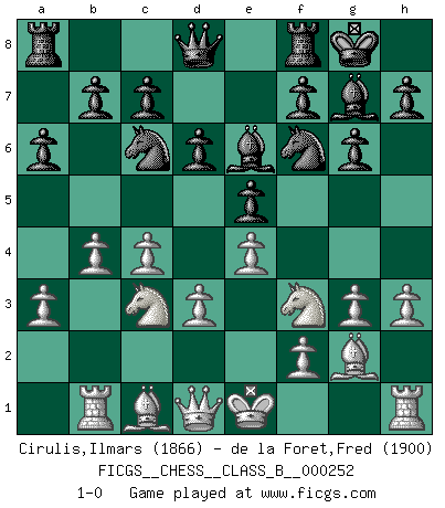 Last move : 1-0 2017 March 14 4:21:44 [Event "FICGS__CHESS__CLASS_B__000252"] [Site "FICGS"] [Date "2016.12.19"] [Round "1"] [White "Cirulis,Ilmars"] [Black "de la Foret,Fred"] [Result "1-0"] [WhiteElo "1866"] [BlackElo "1900"] 1.b4 Nf6 2.Nf3 d6 3.c4 e5 4.Nc3 g6 5.e4 Nc6 6.Rb1 Bg7 7.d3 O-O 8.g3 Bg4 9.Bg2 a6 10.h3 Be6 11.a3 1-0 Polish (Sokolsky) opening Kingside Castling by player Black (move 7) Player White won this chess game. Follow this game move after move (download)You need not play well - just help your opponent to play badly. (Genrikh Chepukaitis) Ich habe kein Problem mit Frauen, sondern nur mit dem Niveau ihres Schachspiels (Judith Polgar) Los asuntos humanos son como una partida de Ajedrez: solo aquellos que no lo toman seriamente, pueden ser llamados buenos jugadores. (Hung Tzu Ch'eng) Ce qui caractérise les parties de combat, c'est que si le défenseur a constamment de difficiles problèmes à résoudre, l'attaquant doit chercher sans relâche de nouvelles possibilités d'attaque. (Koblentz) The project of the man are lower than those of the sky. (Chinese proverb)