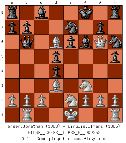 Last move : 0-1 2017 March 21 20:37:58 [Event "FICGS__CHESS__CLASS_B__000252"] [Site "FICGS"] [Date "2016.12.19"] [Round "1"] [White "Green,Jonathan"] [Black "Cirulis,Ilmars"] [Result "0-1"] [WhiteElo "1988"] [BlackElo "1866"] 1.e4 e6 2.d4 d5 3.Nd2 Be7 4.e5 c5 5.Qg4 Kf8 6.Ndf3 Nc6 7.Bd3 Qa5+ 8.Bd2 Qb6 9.Rb1 cxd4 10.Ne2 f6 11.Bf4 h5 12.Qg6 Nh6 13.exf6 Bxf6 14.Bd6+ Ne7 0-1 French : Tarrasch Player Black won this chess game. Follow this game move after move (download)The winner of the game is the player who makes the next-to-last mistake. (Savielly Tartakover) Ich las kürzlich ein Buch von Nietzsche. Er sagte Religion verdumme nur die Menschen. Ich stimme zu. (Robert James Fischer) Vive, pierde y aprende al observar a tu oponente como ganar. (Amber Steenbock) Les Cavaliers se révèlent fort utiles dans les positions fermées. D'habitude, les Fous sont un peu plus forts que les Cavaliers dans les positions ouvertes. Qu'on le veuille ou non, il restera toujours des exceptions ! This is where the fun begins. (Anakin Skywalker in Star Wars ep.3)