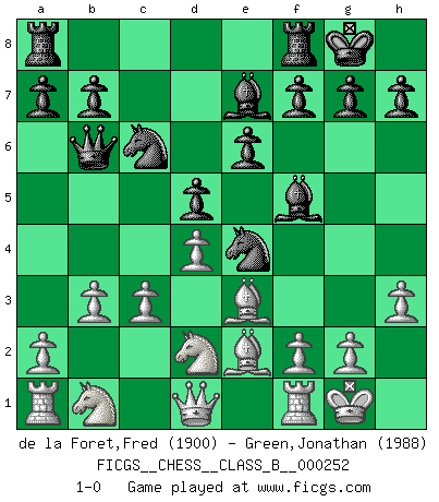 Last move : 1-0 2017 March 26 21:58:20 [Event "FICGS__CHESS__CLASS_B__000252"] [Site "FICGS"] [Date "2016.12.19"] [Round "1"] [White "de la Foret,Fred"] [Black "Green,Jonathan"] [Result "1-0"] [WhiteElo "1900"] [BlackElo "1988"] 1.d4 Nf6 2.Bg5 d5 3.e3 c5 4.Nf3 Ne4 5.Bf4 Qb6 6.b3 Nc6 7.c3 cxd4 8.exd4 Bg4 9.Be2 e6 10.O-O Be7 11.h3 Bf5 12.Be3 O-O 13.Nfd2 1-0 Trompowsky attack (Ruth, Opovcensky Opening) Kingside Castling by player White (move 10) Kingside Castling by player Black (move 12) Player White won this chess game. Follow this game move after move (download)Chess teaches you to control the initial excitement you feel when you see something that looks good and it trains you to think objectively when you're in trouble. (Stanley Kubrick) Ein typischer, sehr verbreiteter Gedankenschädling ist der, daß der betreffende Amateur von der Annanhme ausgeht, daß jeder einzelne Zug etwas zu leisten habe. (Aaron Nimzowitsch) El Ajedrez es un cuento de Hadas de las 1001 metidas de pata. (Savielly Tartakower) La menace est plus forte que l'exécution. (Aaron Nimzovitch) Don't anthropomorphize computers - they hate it. (Anonymous)