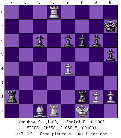 Last move : 1/2-1/2 2006 August 11 9:16:39 [Event "FICGS__CHESS__CLASS_E__000001"] [Site "FICGS"] [Date "2006.04.10"] [Round "1"] [White "Konuhov,Konstantin"] [Black "Forlot,Dominique"] [Result "1/2-1/2"] [WhiteElo "1400"] [BlackElo "1400"] 1.d4 Nf6 2.c4 g6 3.Nc3 d5 4.cxd5 Nxd5 5.e4 Nb6 6.Be3 Bg7 7.Rc1 O-O 8.Nf3 Bg4 9.Be2 Nc6 10.O-O Bxf3 11.Bxf3 Nxd4 12.Be2 Nxe2+ 13.Qxe2 e6 14.Bc5 Re8 15.Nb5 a6 16.Bxb6 axb5 17.Rxc7 Qd6 18.Qxb5 Reb8 19.Rd7 Qc6 20.Qxc6 bxc6 21.Bc7 Rxb2 22.a4 Rxa4 23.Rd8 Bf8 24.Bd6 Re2 25.Bxf8 f6 26.Rfd1 h5 27.Kf1 R4a2 28.Bh6 Kh7 29.Bc1 Rxf2+ 1/2-1/2 King's Indian defense, 3.Nc3 Kingside Castling by player Black (move 7) Kingside Castling by player White (move 10) This chess game ended in a draw. Follow this game move after move (download)For surely of all the drugs in the world, Chess must be the most permanently pleasurable. (Assiac) Schach wird sich dank seiner hohen kulturellen Tradition immer durchsetzen. In näherer Zukunft womöglich sogar als Gegenreaktion auf die maßlose Reizüberflutung im Freizeit- und Spielbereich. (Garry Kasparov) En el Ajedrez, tal como en la vida, las bendiciones de hoy pueden ser el veneno del mañana. (Assaic) Mais n'est-ce pas déjà le limiter injurieusement que d'appeler les échecs un jeu? N'est-ce pas aussi une science, un art, ou quelque chose qui, comme le cercueil de Mahomet entre ciel et terre, est suspendu entre l'un et l'autre, et qui réunit un nombre incroyable de contraires ? (Stefan Zweig) Optimism is a variety of information deficit. Sometimes especially true for correspondence chess games. (Michael Aigner)