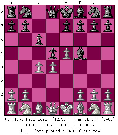 Last move : 1-0 2006 July 10 13:13:46 [Event "FICGS__CHESS__CLASS_E__000005"] [Site "FICGS"] [Date "2006.05.31"] [Round "1"] [White "Guralivu,Paul-Iosif"] [Black "Frank,Brian"] [Result "1-0"] [WhiteElo "1293"] [BlackElo "1400"] 1.e4 c6 2.d4 d5 3.e5 Bf5 4.c4 1-0 This chess game has been lost on time (started : 2006.05.31 7:18:23) Caro-Kann : Advance variation Player White won this chess game. Follow this game move after move (download)Adequate compensation for a sacrifice is having a sound combination leading to a winning position; adequate compensation for a blunder is having your opponent snatch defeat from the jaws of victory. (Bruce A. Moon) Es ist schade, dass viele Schachsportler vergessen, wie wichtig Auftreten und angemessene Kleidung sind. (Alexandra Kosteniuk) Un mal día en el Ajedrez, es mejor que cualquier buen día en el trabajo. (Anonymous) Il vaut mieux sacrifier les pièces de l'adversaire. (Xavier Tartacover) May I never be complete. May I never be content. May I never be perfect. Deliver me, Tyler, from being perfect and complete. (Chuck Palahniuk, Fight Club)