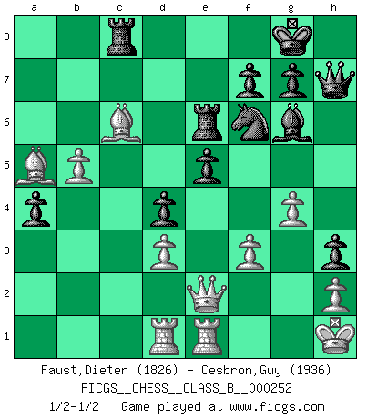Last move : 1/2-1/2 2017 July 19 1:17:35 [Event "FICGS__CHESS__CLASS_B__000252"] [Site "FICGS"] [Date "2016.12.19"] [Round "1"] [White "Faust,Dieter"] [Black "Cesbron,Guy"] [Result "1/2-1/2"] [WhiteElo "1826"] [BlackElo "1936"] 1.Nf3 Nf6 2.c4 e6 3.a3 d5 4.e3 c5 5.b3 Nc6 6.Bb2 d4 7.exd4 Nxd4 8.Nxd4 cxd4 9.d3 e5 10.Nd2 Bd6 11.Be2 Bf5 12.b4 O-O 13.Nb3 b6 14.O-O Qd7 15.Bf3 Rab8 16.Re1 Bg6 17.Rc1 a5 18.b5 a4 19.Bc6 Qf5 20.c5 axb3 21.cxd6 Rfd8 22.Qxb3 Rxd6 23.a4 Re6 24.f3 h5 25.Rcd1 h4 26.Qc4 h3 27.g3 Qh5 28.Rf1 Bf5 29.Qc2 Rd8 30.Kh1 Bg6 31.Qc4 Qh6 32.Bc1 Qh7 33.Ba3 Bf5 34.g4 Bg6 35.Bb4 Qh4 36.Be1 Qg5 37.Qa2 Qe3 38.Bf2 Qg5 39.a5 bxa5 40.Be1 a4 41.Bd2 Qh4 42.Ba5 Rc8 43.Qe2 Qh7 44.Rfe1 1/2-1/2 Reti Opening Kingside Castling by player Black (move 12) Kingside Castling by player White (move 14) This chess game ended in a draw. Follow this game move after move (download)Chess is a foolish expedient for making idle people believe they are doing something very clever when they are only wasting their time. (George Bernard Shaw) Mutter, ich bin eben Ex-Weltmeister geworden. --beim nach Hause Kommen nach dem Verlust des WM-Titels an Mihail Botvinnik -- (Mikhail Nekhemyevich Tal) Los Peones son el alma de una partida de Ajedrez. (Francois Andre Danican Philidor) Les réformistes prétendent que les progrès de la théorie conduiront à la disparition des échecs, et qu'il faut, pour leur rendre vie, en remanier les règles. En réalité, qu'exprime cette affirmation? Le mépris de l'intuition, de l'imagination et de tous les autres éléments qui font des échecs un art. (Alexander Alekhine) Luck is when opportunity knocks and you answer. (Anonymous)