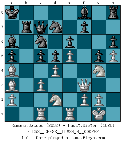 Last move : 1-0 2017 March 30 16:1:7 [Event "FICGS__CHESS__CLASS_B__000252"] [Site "FICGS"] [Date "2016.12.19"] [Round "1"] [White "Romano,Jacopo"] [Black "Faust,Dieter"] [Result "1-0"] [WhiteElo "2032"] [BlackElo "1826"] 1.e4 e6 2.d4 d5 3.Nd2 a6 4.Bd3 Nc6 5.Ngf3 g6 6.O-O Bg7 7.c3 Nge7 8.e5 a5 9.Re1 b6 10.Nf1 Ba6 11.Bc2 Nb8 12.h4 h6 13.h5 g5 14.Ne3 Nd7 15.b3 c5 16.Ba3 Qc7 17.Rc1 Nc6 18.Bb1 O-O-O 19.b4 Bf8 20.bxc5 bxc5 21.Bc2 Kb7 22.Ba4 Ka8 23.Nd2 Rb8 24.Ng4 Rb7 25.Qf3 1-0 French : Tarrasch Kingside Castling by player White (move 6) Queenside Castling by player Black (move 18) Player White won this chess game. Follow this game move after move (download)The King is a fighting piece. Use it ! (Wilhelm Steinitz) Matt entspricht nicht immer den Tatsachen. (Savielly Grigorievitsch Tartakower) Una victoria por una combinación errónea, aunque sea espectacular, me llena de horror artístico. (Wilhelm Steinitz) Dieu déplace le joueur, et celui-ci la pièce. Quel Dieu derrière Dieu commence donc la trame ? Arturo Perez-Reverte (prix de littérature policière 1993). Over-the-board chess is the favorite of mortals, correspondence chess is the favorite of the gods. (Eduard Dyckhoff)