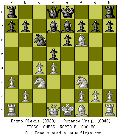 Last move : 1-0 2017 February 12 21:26:24 [Event "FICGS__CHESS__RAPID_E__000180"] [Site "FICGS"] [Date "2016.12.22"] [Round "1"] [White "Bromo,Alexis"] [Black "Puzanov,Vasyl"] [Result "1-0"] [WhiteElo "0929"] [BlackElo "0946"] 1.d4 c5 2.e3 e6 3.Nf3 cxd4 4.exd4 d5 5.a3 Nf6 6.c4 Nc6 7.Nc3 Bd7 8.Bg5 Be7 9.Bxf6 1-0 Old Benoni defense Player White won this chess game. Follow this game move after move (download)The mistakes are there, waiting to be made. (Savielly Tartakower) Wenn du nicht weißt was du tun sollst, warte bis dein Gegner eine Idee hat. Sie wird sicher schlecht sein. (Siegbert Tarrasch) El Ajedrez es un invernadero donde los frutos del carácter pueden madurar mas completamente que en la vida. (Edward Morgan Foster) La tactique, c'est ce que vous faites quand il y a quelque chose à faire; la stratégie, c'est ce que vous faites quand il n'y a rien à faire. (Savielli Tartacower) Chess is as much a mystery as women. (Purdy)