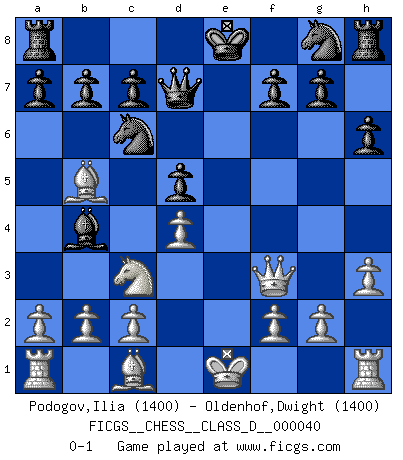Last move : 0-1 2007 May 13 15:6:44 [Event "FICGS__CHESS__CLASS_D__000040"] [Site "FICGS"] [Date "2007.04.01"] [Round "1"] [White "Podogov,Ilia"] [Black "Oldenhof,Dwight"] [Result "0-1"] [WhiteElo "1400"] [BlackElo "1400"] 1.d4 d5 2.Nf3 h6 3.Nc3 Nc6 4.e3 Bg4 5.h3 Bxf3 6.Qxf3 e6 7.Bb5 Qd7 8.e4 Bb4 9.exd5 exd5 0-1 This chess game has been lost on time (started : 2007.04.01 13:25:27) Queen's pawn game Player Black won this chess game. Follow this game move after move (download)Is Bobby Fischer quite sane ? (Salo Flohr) Im Spitzenschach von heute geht es nur um Vorbereitung, um tiefgründige, sorgfältige Eröffnungsvorbereitung. (Nigel Short) La mitad de las variaciones que son calculadas en una partida de torneo, resultan ser completamente superfluas. Desafortunadamente, nadie sabe por adelantado cual mitad. (Jan Tinman) Un millionnaire : 'Monsieur Steinitz ! Vous ne participez aux tournois que pour l'argent, alors que moi je n'y viens que pour l'honneur.' Steinitz : 'Chacun joue pour ce qu'il n'a pas'... There's always a bigger fish. (Qui-Gon Jinn in Star Wars ep.1)