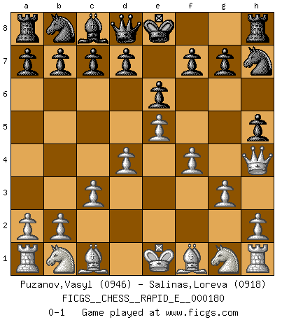 Last move : 0-1 2017 February 27 17:34:37 [Event "FICGS__CHESS__RAPID_E__000180"] [Site "FICGS"] [Date "2016.12.22"] [Round "1"] [White "Puzanov,Vasyl"] [Black "Salinas,Loreva"] [Result "0-1"] [WhiteElo "0946"] [BlackElo "0918"] 1.e4 e6 2.d4 Bb4+ 3.c3 Be7 4.f4 Nf6 5.e5 Ne4 6.g3 Bh4 7.Qf3 Ng5 8.Qg4 h5 9.Qxh4 Nh7 0-1 This chess game has been lost on time (started : 2016.12.22 2:19:18) French defense Player Black won this chess game. Follow this game move after move (download)Nothing excites jaded Grandmasters more than a theoretical novelty. (Dominic Lawson) Das Schach hält seine Meister in eigenen Banden, Fesseln; auf vielerlei Weise formt es ihren Geist, so dass die innere Freiheit selbst des Stärksten beeinflusst wird. (Albert Einstein) Si pudieramos observar el interior de la cabeza de un jugador de Ajedrez, encontraríamos ahí un mundo lleno de sentimientos, imágenes, ideas, emoción y pasión. (Alfred Binet) Pour moi, les échecs ne sont pas un jeu mais un art. (Alexandre Alekhine) The only thing that matters is the evidence. (Horatio Caine, C.S.I. Miami)