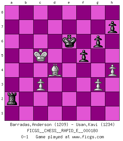 Last move : 0-1 2017 January 22 16:24:37 [Event "FICGS__CHESS__RAPID_E__000180"] [Site "FICGS"] [Date "2016.12.22"] [Round "1"] [White "Barradas,Anderson"] [Black "Usan,Kavi"] [Result "0-1"] [WhiteElo "1209"] [BlackElo "1234"] 1.e4 e5 2.Nf3 Nc6 3.d4 exd4 4.Nxd4 Ne5 5.Nc3 Bb4 6.Bd2 Bxc3 7.Bxc3 Nf6 8.Qe2 O-O 9.O-O-O a6 10.f4 Nc6 11.Nxc6 bxc6 12.e5 Nd5 13.Bd2 Re8 14.Qg4 d6 15.Qg3 dxe5 16.fxe5 Be6 17.Bh6 g6 18.Bg5 Qb8 19.b3 Nb4 20.Kb1 Qb6 21.Be3 Qa5 22.a4 c5 23.Bd2 Qb6 24.Qc3 Nd5 25.Qf3 Ne7 26.h4 Bd5 27.Qg3 Nc6 28.Bf4 c4 29.Rxd5 cxb3 30.Qxb3 Qf2 31.g3 Rab8 32.Bb5 axb5 33.axb5 Nd4 34.Qb2 Qf3 35.Qxd4 Qxh1+ 36.Kb2 c6 37.Rc5 Rxb5+ 38.Rxb5 cxb5 39.Qd7 Ra8 40.Kc3 Qe4 41.Qxb5 Ra3+ 42.Kb2 Ra8 43.Kb3 Kg7 44.e6 Qxe6+ 45.Kc3 Rc8+ 46.Kb2 Qe4 47.c3 Ra8 48.Qe5+ Qxe5 49.Bxe5+ f6 50.Bd4 Kf7 51.Kb3 f5 52.Kc4 Ke6 53.Kc5 Ra2 0-1 Scotch game Kingside Castling by player Black (move 8) Queenside Castling by player White (move 9) 10 pieces endgame at move 49 : White KBPPP , Black KRPPP WHITE : King + 1 Bishop 3 Pawns BLACK : King + 1 Rook 3 Pawns Player Black won this chess game. Follow this game move after move (download)Do you realize Fischer almost never has any bad pieces? He exchanges them, and the bad pieces remain with his opponents. (Yuri Balashov) Die Elozahlen sind sehr schlecht für das Schach. Jetzt ist Schach eine Sportindustrie, die darauf zielt Elopunkte zu machen. (Miguel Najdorf) Bendita sea la memoria de aquel que dio al mundo este juego inmortal. (A. G. Gardiner) On n'a jamais que l'âge auquel on a commence à jouer aux échecs car après on cesse de vieillir. (Capablanca) There will be no order, only chaos. (Sol Robeson in Pi by Darren Aronofsky)