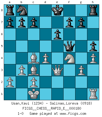 Last move : 1-0 2017 February 21 16:26:56 [Event "FICGS__CHESS__RAPID_E__000180"] [Site "FICGS"] [Date "2016.12.22"] [Round "1"] [White "Usan,Kavi"] [Black "Salinas,Loreva"] [Result "1-0"] [WhiteElo "1234"] [BlackElo "0918"] 1.e4 e6 2.d4 Qh4 3.Nc3 Bb4 4.Bd2 Bxc3 5.Bxc3 Qxe4+ 6.Ne2 d5 7.Qd2 Bd7 8.O-O-O Nf6 9.f3 Qg6 10.g3 Ba4 11.b3 Bc6 12.Nf4 Qf5 13.h4 h5 14.Bd3 Ne4 15.fxe4 dxe4 16.Bc4 e3 17.Qxe3 Bxh1 18.Rxh1 1-0 This chess game has been lost on time (started : 2016.12.22 2:19:18) French defense Queenside Castling by player White (move 8) Player White won this chess game. Follow this game move after move (download)I won't play with you anymore. You have insulted my friend. - When an opponent cursed himself for a blunder. (Miguel Najdorf) Privat ist Kortschnoi kein schlechter Mensch, sehr sympathisch. Aber während des Spiels ist er grausam. Er will dich töten. (Miguel Najdorf) ¡Examina movidas que hagan daño! Un buen ojo for movidas desvastantes es mucho mas importante que el conocimiento de principios estratégicos. (Purdy) Aux échecs, l'amour-propre est satisfait quand on remporte la victoire, mais il n'y a pas de honte à être battu. (Benjamin Franklin) The modern world has divided itself into Conservatives and Progressives. The business of Progressives is to go on making mistakes. The business of the Conservatives is to prevent the mistakes from being corrected. (G.K. Chesterton)