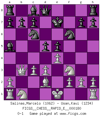 Last move : 0-1 2017 February 7 2:30:51 [Event "FICGS__CHESS__RAPID_E__000180"] [Site "FICGS"] [Date "2016.12.22"] [Round "1"] [White "Salinas,Marcelo"] [Black "Usan,Kavi"] [Result "0-1"] [WhiteElo "1062"] [BlackElo "1234"] 1.e4 e5 2.Qf3 Nc6 3.Bc4 Nf6 4.d3 Nd4 5.Bxf7+ Kxf7 6.Qd1 Bc5 7.b4 Bxb4+ 8.c3 Ba5 9.Bd2 Nc6 10.Qb3+ Ke7 11.Nf3 d5 0-1 This chess game has been lost on time (started : 2016.12.22 2:19:18) Variation Napoleon's Opening : Napoleon's Opening Player Black won this chess game. Follow this game move after move (download)For me, Chess is life and every game is like a new life. Every Chess player gets to live many lives in one lifetime. (Eduard Gufeld) Das Schachspiel ist ein See, in welchem eine Mücke baden und ein Elefant ertrinken kann. (Emanuel Lasker) Observen a Garry Kasparov. Después de una derrota, invariablemente el gana la próxima partida. Prácticamente hace pedazos a su siguiente oponente. Eso es algo que tenemos que aprender a lograr. (Maurice Ashley) Il n'y a pas eu de défaite parce que je ne crois pas que cet ordinateur ait jamais existé. IBM a triché en refusant d'imprimer les modes de recherche de la machine. C'est évident, pendant le match, des coups décisifs ont été joués par des êtres humains. Aujourd'hui, les meilleurs spécialistes en informatique ne peuvent toujours pas expliquer comment Deep-Blue a pu jouer contre la logique des ordinateurs. IBM a gagné une guerre de communication, mais ils sont incapables de prouver que l'ordinateur a gagné tout seul. (Garry Kasparov) If you ain't just a little scared when you enter a casino, you are either very rich or you haven't studied the games enough. (Pappy)