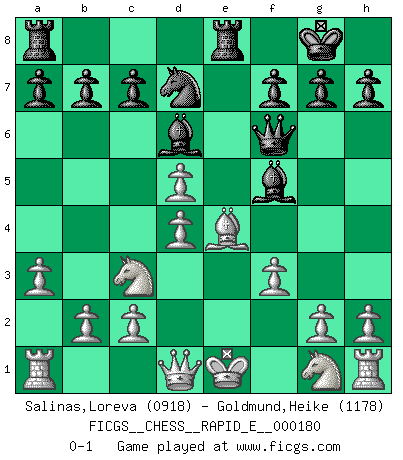 Last move : 0-1 2017 February 7 14:32:25 [Event "FICGS__CHESS__RAPID_E__000180"] [Site "FICGS"] [Date "2016.12.22"] [Round "1"] [White "Salinas,Loreva"] [Black "Goldmund,Heike"] [Result "0-1"] [WhiteElo "0918"] [BlackElo "1178"] 1.Nc3 Nf6 2.e4 e5 3.a3 d5 4.d4 Bd6 5.exd5 O-O 6.Bg5 Bf5 7.Bd3 e4 8.Bxf6 Qxf6 9.Bxe4 Re8 10.f3 Nd7 0-1 This chess game has been lost on time (started : 2016.12.22 2:19:18) Dunst (Sleipner, Heinrichsen) Opening Kingside Castling by player Black (move 5) Player Black won this chess game. Follow this game move after move (download)Fischer Chess play was always razor-sharp, rational and brilliant. One of the best ever. (Dave Regis) In der Schule lernt man nichts. Es ist nur Zeitverschwendung. (Robert James Fischer) Un mal plan es mejor que no tener ningún plan. (Frank Marshall) Les échecs sont utiles à l'exercice de la faculté de penser et à celle de l'imagination. Car nous devons posséder une méthode élaborée pour atteindre des buts partout où nous devons conduire notre raison. (Leibnitz) Nobody is always a winner, and anybody who says he is, is either a liar or doesn't play poker. (Amarillo Slim)
