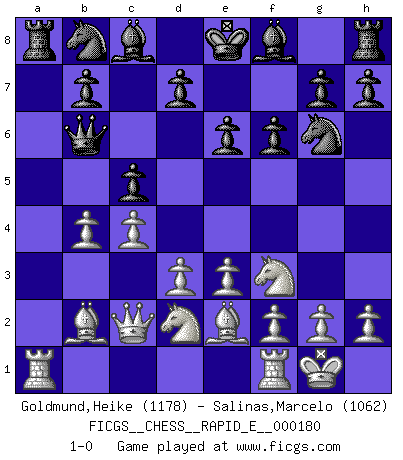 Last move : 1-0 2017 February 16 3:42:43 [Event "FICGS__CHESS__RAPID_E__000180"] [Site "FICGS"] [Date "2016.12.22"] [Round "1"] [White "Goldmund,Heike"] [Black "Salinas,Marcelo"] [Result "1-0"] [WhiteElo "1178"] [BlackElo "1062"] 1.b4 Nf6 2.Bb2 e6 3.a3 Nd5 4.c4 Nf4 5.e3 Ng6 6.Nf3 f6 7.Be2 c5 8.b5 a6 9.d3 Qa5+ 10.Nbd2 axb5 11.O-O Qb6 12.Qc2 b4 13.axb4 1-0 This chess game has been lost on time (started : 2016.12.22 2:19:18) Polish (Sokolsky) opening Kingside Castling by player White (move 11) Player White won this chess game. Follow this game move after move (download)Those who say they understand Chess, understand nothing. (Robert Hubner) Das ganze Leben mit einer Ehefrau ist wie ein Endspiel mit ungleichfarbigen Läufern. (Viktor Kortschnoi) Es muy difícil jugar en contra de la teoría de Einstein. - en su primera derrota en contra de Fischer (Mikhail Tal) Avant la finale, les dieux ont créé le milieu de partie. (Tarrasch) I feel so... helpless. (C-3PO in Star Wars ep.3)