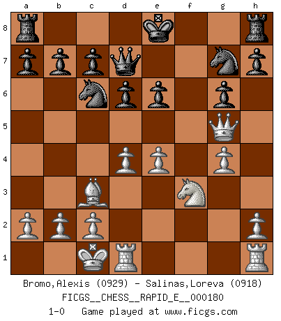 Last move : 1-0 2017 March 16 8:8:57 [Event "FICGS__CHESS__RAPID_E__000180"] [Site "FICGS"] [Date "2016.12.22"] [Round "1"] [White "Bromo,Alexis"] [Black "Salinas,Loreva"] [Result "1-0"] [WhiteElo "0929"] [BlackElo "0918"] 1.d4 Nf6 2.Nc3 e6 3.e4 Bb4 4.f3 d6 5.Bd2 Bxc3 6.Bxc3 Nh5 7.Bb5+ Bd7 8.Bxd7+ Qxd7 9.Qd2 f5 10.Qg5 g6 11.g4 fxg4 12.fxg4 Ng7 13.O-O-O Nc6 14.Nf3 1-0 This chess game has been lost on time (started : 2016.12.22 2:19:18) Queen's pawn game Queenside Castling by player White (move 13) Player White won this chess game. Follow this game move after move (download)Strategy requires thought, tactics require observation. (Max Euwe) Irgendwie scheint mir sonntags früh um 9 Uhr der Killerinstinkt verloren gegangen zu sein. (Alexej Shirov) El Ajedrez es un invernadero donde los frutos del carácter pueden madurar mas completamente que en la vida. (Edward Morgan Foster) Dieu déplace le joueur, et celui-ci la pièce. Quel Dieu derrière Dieu commence donc la trame ? Arturo Perez-Reverte (prix de littérature policière 1993). The intuitive mind is a sacred gift; the rational mind is a faithful servant. We have created a society that honors the servant but has forgotten the gift. (Albert Einstein)