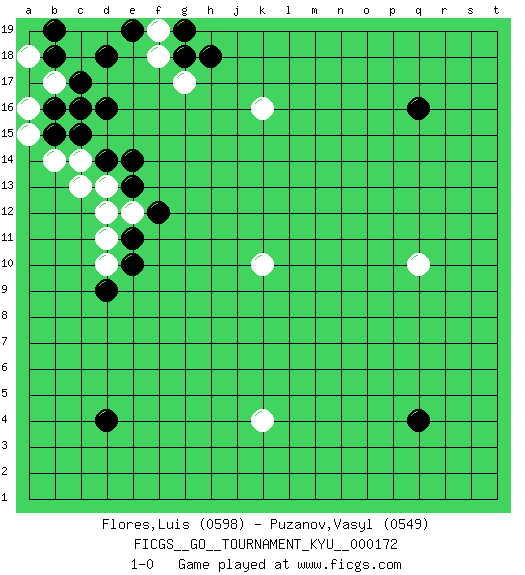 Last move : 1-0 2017 March 6 23:11:51 [Event "FICGS__GO__TOURNAMENT_KYU__000172"] [Site "FICGS"] [Date "2016.12.24"] [Round "1"] [Black "Flores,Luis"] [White "Puzanov,Vasyl"] [Result "1-0"] [Rating 1 "0598"] [Rating 2 "0549"] 1.d4 k10 2.q16 q10 3.q4 k16 4.d16 k4 5.e10 d10 6.d9 d11 7.e11 e12 8.f12 d12 9.e13 d13 10.d14 c14 11.e14 c13 12.c15 b14 13.b15 a15 14.b16 a16 15.c17 b17 16.b18 a18 17.c16 c18 18.b19 c19 19.d18 d19 20.e19 f19 21.g19 f18 22.g18 g17 23.h18 1-0 Here are the names of the openings (joseki) played in the four corners : Corner d16 : d16 d11 Hoshi (Hwajeom, Seongjeom, Xingwei`) 4-4 Point. The star or hoshi (4-4) point, emphasizing influence at the potential expense of territory. Player Black won this Go (weiqi, baduk) game. Follow this game move after move (download)There are players who don't accept exchange: they play many moves that perpetuate a previous state of the game. (Pierre Audouard) The only difference between a tax man and a taxidermist is that the taxidermist leaves the skin. (Mark Twain)
