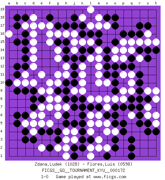 Last move : 1-0 2017 July 12 11:35:47 [Event "FICGS__GO__TOURNAMENT_KYU__000172"] [Site "FICGS"] [Date "2016.12.24"] [Round "1"] [Black "Zdana,Ludek"] [White "Flores,Luis"] [Result "1-0"] [Rating 1 "1028"] [Rating 2 "0598"] 1.q16 d16 2.q3 d4 3.r9 c10 4.k4 j3 5.k3 j4 6.k16 j16 7.j17 j15 8.h17 h16 9.g17 g16 10.c14 f17 11.b17 c17 12.b15 d15 13.c18 d18 14.c16 d17 15.b18 e17 16.c15 d14 17.m16 l15 18.l16 k15 19.m15 m14 20.n14 m13 21.n13 m12 22.n12 m11 23.n11 m10 24.j5 h4 25.k6 l5 26.k5 l4 27.l3 m3 28.n6 m5 29.h5 h3 30.f4 f5 31.g4 g6 32.g3 g2 33.f2 h1 34.j2 h2 35.j1 l2 36.k2 m2 37.r5 n4 38.p5 n7 39.o6 o8 40.e10 e11 41.c9 d10 42.d9 e9 43.e8 f10 44.c6 e7 45.d7 f8 46.d8 e6 47.c3 c5 48.b6 d6 49.b5 e5 50.b9 b10 51.r17 q10 52.r10 q9 53.q8 p9 54.q12 q11 55.r11 p8 56.q7 q6 57.r6 m6 58.m7 m8 59.l7 l8 60.k8 k9 61.j8 j9 62.p12 n10 63.o11 p11 64.h8 h7 65.j7 g8 66.h9 f7 67.h10 g11 68.j11 k10 69.j12 h12 70.k13 k11 71.h13 g13 72.h14 g14 73.k14 k12 74.l14 l13 75.c12 d12 76.c13 d13 77.p7 o13 78.p14 q15 79.p16 p15 80.o15 q14 81.q13 p13 82.r14 r15 83.s14 s15 84.t14 t15 85.c4 d5 86.d3 e2 87.e4 p2 88.q2 p3 89.p4 o4 90.o5 n5 91.o10 r13 92.s13 s7 93.r7 m17 94.n18 n17 95.o17 m18 96.o18 l17 97.k17 k18 98.j18 l19 99.o2 o1 100.o3 p1 101.n1 n2 102.q1 j14 103.j13 h11 104.j10 l6 105.k7 s6 106.s5 t8 107.s8 s9 108.r8 t5 109.t4 t6 110.s4 t9 111.g9 f9 112.o7 n8 113.g15 f16 114.h15 f15 115.h6 g7 116.f18 o14 117.o12 p14 118.r16 s16 119.s17 g10 120.b11 c11 121.b12 a16 122.a10 l1 123.o9 1-0 Here are the names of the openings (joseki) played in the four corners : Player Black won this Go (weiqi, baduk) game. Follow this game move after move (download)Beware of the clumsy double contact. (Anonymous) Optimism is a variety of information deficit. Sometimes especially true for correspondence chess games. (Michael Aigner)