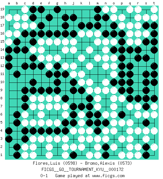 Last move : 0-1 2017 July 2 14:55:11 [Event "FICGS__GO__TOURNAMENT_KYU__000172"] [Site "FICGS"] [Date "2016.12.24"] [Round "1"] [Black "Flores,Luis"] [White "Bromo,Alexis"] [Result "0-1"] [Rating 1 "0598"] [Rating 2 "0573"] 1.d16 q4 2.d4 q16 3.k17 k4 4.l5 l4 5.m4 m3 6.m5 n4 7.n5 o5 8.o4 n3 9.p5 o6 10.p4 p3 11.o3 o2 12.p2 q3 13.n2 q2 14.o1 m2 15.m1 l1 16.q1 r1 17.p6 n6 18.m6 o7 19.p7 m7 20.l7 k5 21.l6 m8 22.l8 m9 23.n11 n10 24.m10 n9 25.m11 l9 26.k9 k8 27.k7 j8 28.j7 h7 29.j6 h6 30.j5 j4 31.h5 g5 32.h4 h3 33.g4 g3 34.f4 f3 35.e4 e3 36.g6 f5 37.f6 e5 38.h8 g7 39.j9 g8 40.g9 f8 41.f9 e8 42.e6 d5 43.d6 c5 44.b5 c6 45.c8 d7 46.c7 d8 47.d9 e7 48.e9 f7 49.l2 n1 50.o2 k2 51.m1 l3 52.n1 p8 53.q8 q7 54.q6 r7 55.p9 o8 56.r8 r6 57.r2 p1 58.c4 q5 59.b6 e6 60.o10 o9 61.p10 s8 62.s9 r9 63.q9 r10 64.s10 r11 65.s11 r12 66.s7 s6 67.t8 t6 68.t10 s12 69.t12 t13 70.t11 t7 71.s8 o11 72.p11 o12 73.p12 o13 74.p13 p14 75.q14 q15 76.r14 r15 77.s15 s14 78.t15 t14 79.r16 r17 80.s1 q1 81.o14 n14 82.p15 o15 83.p14 n13 84.p16 q17 85.o16 n15 86.n16 m16 87.m17 l16 88.l17 k16 89.j16 j15 90.h16 h15 91.g16 g15 92.f16 f15 93.e16 e15 94.d15 d14 95.c14 c13 96.d13 e14 97.c12 b13 98.b14 b12 99.d12 e13 100.e12 f12 101.f11 g11 102.g12 f13 103.h11 h12 104.g10 g13 105.g11 j11 106.h13 j12 107.j13 l10 108.l11 k10 109.j10 k11 110.k12 l12 111.m12 k13 112.l13 l14 113.m14 m13 114.r13 s16 115.s13 p17 116.o17 o18 117.n18 p18 118.m18 n19 119.m19 o19 120.s17 s18 121.t17 q19 122.t14 r18 123.t16 t18 124.r16 d3 125.c3 c2 126.b2 c1 127.b1 d2 128.g2 h2 129.g1 h1 130.e1 k6 131.e2 n12 132.b11 j14 133.a12 s16 134.a13 r16 135.r3 s4 136.s3 t4 137.t3 t2 138.t1 r4 139.s2 t2 140.a3 h14 141.a4 j17 142.h17 m15 143.j18 f2 144.c9 f1 145.d10 d1 146.s19 r19 147.q10 pass 148.q11 t19 149.q12 c17 150.c16 d17 151.b17 b18 152.a17 a18 153.e17 e18 154.f18 b16 155.d18 a16 156.b15 c18 157.e19 c19 158.g19 b17 159.d19 a15 160.a14 pass 161.s2 s3 162.s1 r2 163.p6 p5 164.j1 j2 165.j3 k3 166.n1 o2 167.n2 m1 168.o3 o4 169.s5 pass 170.h18 pass 0-1 Here are the names of the openings (joseki) played in the four corners : Corner q4 : q4 l5 Hoshi (Hwajeom, Seongjeom, Xingwei`) 4-4 Point. The star or hoshi (4-4) point, emphasizing influence at the potential expense of territory. Corner q16 : q16 n11 Hoshi (Hwajeom, Seongjeom, Xingwei`) 4-4 Point. The star or hoshi (4-4) point, emphasizing influence at the potential expense of territory. Corner d4 : d4 j8 Hoshi (Hwajeom, Seongjeom, Xingwei`) 4-4 Point. The star or hoshi (4-4) point, emphasizing influence at the potential expense of territory. Player White won this Go (weiqi, baduk) game. Follow this game move after move (download)Be a little patient. Keshi works ! (Anonymous) Somehow our devils are never quite what we expect when we meet them face to face. (Nelson DeMille)