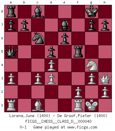 Last move : 0-1 2007 July 5 21:55:59 [Event "FICGS__CHESS__CLASS_D__000040"] [Site "FICGS"] [Date "2007.04.01"] [Round "1"] [White "Lorena,June"] [Black "De Groof,Pieter"] [Result "0-1"] [WhiteElo "1400"] [BlackElo "1400"] 1.Nc3 f5 2.Nf3 Nf6 3.e3 e6 4.a3 Be7 5.Bc4 O-O 6.d4 Ne4 7.O-O Nxc3 8.bxc3 Bf6 9.Bd3 d6 10.e4 fxe4 11.Bxe4 d5 12.Bd3 c5 13.Ne5 c4 14.Qh5 cxd3 15.cxd3 Nc6 16.Ng4 Be7 17.g3 Rf5 18.Qh3 Qa5 0-1 This chess game has been lost on time (started : 2007.04.01 13:25:27) Dunst (Sleipner, Heinrichsen) Opening Kingside Castling by player Black (move 5) Kingside Castling by player White (move 7) Player Black won this chess game. Follow this game move after move (download)Chess is war over the board. The object is to crush the opponents mind. (Bobby Fischer) Ein Remis kann durch Wiederholung von drei Zügen oder durch einen schlechte Zug erreicht werden. (Savielly Grigorievitsch Tartakower) Debemos de asegurarnos de que el Ajedrez no se convierta en un lenguaje muerto, muy interesante, pero solo para un grupo muy pequeño. (Sytze Faber) On a dit que l'homme se distingue de l'animal par le fait qu'il achète plus de livres qu'il ne peut en lire. Je voudrais suggérer qu'inclure à la liste des livres quelques livres d'échecs rendrait la distinction manifeste. (Edward Lasker) Be who you are, and say what you feel because those who mind don't matter, and those who matter don't mind. (Dr Seuss)