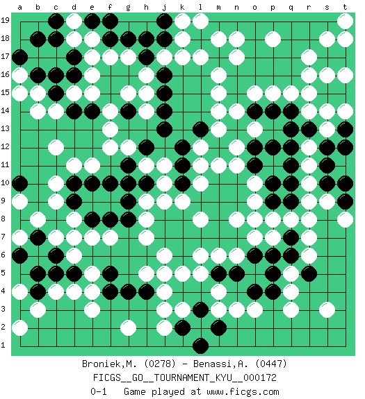 Last move : 0-1 2017 June 27 0:54:50 [Event "FICGS__GO__TOURNAMENT_KYU__000172"] [Site "FICGS"] [Date "2016.12.24"] [Round "1"] [Black "Broniek,Mariusz Maciej"] [White "Benassi,Aspasio"] [Result "0-1"] [Rating 1 "0278"] [Rating 2 "0447"] 1.q16 c17 2.d17 q4 3.d16 d4 4.c16 b17 5.b16 r17 6.a17 r16 7.b18 q15 8.c18 c10 9.r15 r14 10.s15 s14 11.q14 p15 12.p14 o15 13.r13 s13 14.s12 s16 15.t15 t16 16.t13 t14 17.t12 r12 18.q13 r11 19.o14 n14 20.n15 m15 21.n16 m16 22.o16 m14 23.p16 r15 24.q17 d7 25.q10 n17 26.o17 n18 27.o18 l17 28.q12 r10 29.q11 r9 30.q9 q8 31.r18 s18 32.q19 p18 33.q18 p8 34.n19 m18 35.p19 o10 36.o19 n12 37.s19 t18 38.p17 e3 39.k4 m3 40.k10 l5 41.k6 k5 42.j5 j4 43.h4 j3 44.l4 m4 45.m5 l6 46.l7 m6 47.n5 j6 48.k7 h5 49.n7 n6 50.o6 o7 51.o8 p7 52.m7 j5 53.p5 q5 54.p6 r7 55.j16 j17 56.p9 o9 57.j7 h7 58.q6 r6 59.o4 q3 60.q7 n8 61.n9 h9 62.m8 o8 63.o11 n11 64.n10 l10 65.p10 r8 66.m9 k9 67.l9 j10 68.k11 l11 69.k12 l12 70.l13 h16 71.j15 h15 72.j14 h14 73.j13 g12 74.m12 m13 75.m10 m11 76.k8 j9 77.j8 h8 78.d10 d11 79.e10 c9 80.d9 e11 81.f10 c12 82.g10 h11 83.h10 f17 84.o12 o13 85.p12 e15 86.g11 f12 87.h12 j11 88.g9 d8 89.e8 e7 90.f8 c14 91.g4 g2 92.f5 f7 93.e14 d15 94.c15 b14 95.d14 f14 96.f15 e16 97.f16 e17 98.g14 f13 99.s11 e18 100.m19 l19 101.r19 t19 102.h17 p18 103.j18 k17 104.h18 g15 105.g16 g17 106.g18 d19 107.c19 o3 108.d5 c4 109.c5 e5 110.f4 e4 111.f18 a15 112.f19 d18 113.g8 b15 114.s10 a16 115.t10 s9 116.t9 t8 117.r5 s3 118.l3 l2 119.m2 n3 120.k2 k3 121.l1 j2 122.l3 l8 123.b4 b3 124.b5 d6 125.c6 c7 126.b7 b8 127.a6 a4 128.a3 a2 129.a8 a9 130.e19 k18 131.j19 k19 132.a10 a7 133.p4 pass 0-1 Here are the names of the openings (joseki) played in the four corners : Corner d16 : c17 d17 San-San (Sam-Sam, San-San) 3-3 Point. The San-San (3-3) point, emphasizing territory at the expense of influence. This move is not recommended. Black should envisage 4-4, 5-3, 6-4, 5-4 or 6-3 instead. Corner q16 : q16 r17 Hoshi (Hwajeom, Seongjeom, Xingwei`) 4-4 Point. The star or hoshi (4-4) point, emphasizing influence at the potential expense of territory. Player White won this Go (weiqi, baduk) game. Follow this game move after move (download)The rectangular six is normally alive. (Anonymous) Shallow men believe in luck. Strong men belive in cause and effect. (Ralph Waldo Emerson)