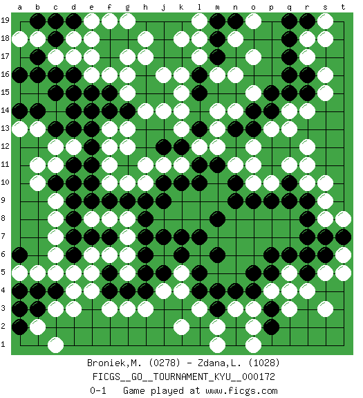 Last move : 0-1 2017 September 11 12:19:59 [Event "FICGS__GO__TOURNAMENT_KYU__000172"] [Site "FICGS"] [Date "2016.12.24"] [Round "1"] [Black "Broniek,Mariusz Maciej"] [White "Zdana,Ludek"] [Result "0-1"] [Rating 1 "0278"] [Rating 2 "1028"] 1.q16 d4 2.d16 q4 3.q10 g17 4.d11 c14 5.e14 c17 6.c16 d17 7.b17 e16 8.d15 c12 9.e15 f16 10.f15 g15 11.c18 d18 12.d19 e18 13.b19 e19 14.c19 k16 15.g19 c11 16.c10 c9 17.d9 b10 18.d10 c8 19.f18 h18 20.f17 e17 21.g18 h17 22.h16 g16 23.h19 j19 24.j18 f19 25.k19 o17 26.h19 g19 27.j19 l18 28.j17 j16 29.h15 h14 30.c13 b13 31.d13 d12 32.e12 b11 33.b14 b15 34.a14 a15 35.d14 a18 36.c15 b18 37.b16 a13 38.a16 k4 39.j15 k14 40.l16 k15 41.k17 l17 42.m17 l19 43.k10 r14 44.g14 j14 45.d8 c7 46.d7 c6 47.d6 g13 48.f14 g12 49.m18 r17 50.r15 s15 51.r16 s16 52.q17 r18 53.q18 q14 54.p15 r11 55.q6 s5 56.n4 o3 57.p5 p4 58.o4 n3 59.m3 m2 60.m4 l3 61.n2 o2 62.n1 m1 63.p3 q3 64.p2 o1 65.l4 k2 66.j5 d5 67.m19 k18 68.r5 r4 69.r6 q5 70.p6 s3 71.s6 t6 72.t7 t5 73.s7 m12 74.l5 j4 75.h4 h3 76.h5 g3 77.g4 f3 78.f4 e4 79.f5 n16 80.m11 l12 81.l11 n14 82.r19 s18 83.q19 s19 84.k12 k13 85.l13 m13 86.n9 j11 87.h9 k11 88.j12 h11 89.f9 n11 90.l10 o10 91.o9 g10 92.g9 p10 93.p9 q11 94.q9 s9 95.n10 o12 96.m8 k5 97.k6 l6 98.o5 j6 99.k7 f6 100.h6 e5 101.j7 e6 102.e7 g7 103.h7 g8 104.h8 r10 105.r9 s8 106.r8 s10 107.m6 g6 108.l7 f10 109.e10 f11 110.j10 h10 111.j9 f8 112.e9 f13 113.e13 f12 114.e11 m16 115.l15 m14 116.p11 o11 117.p12 p13 118.r7 t8 119.b3 c3 120.b4 b2 121.a2 c1 122.a4 b5 123.q12 r12 124.o13 q13 125.o14 o15 126.p14 n18 127.q15 e8 128.f7 g5 129.c4 d3 130.a6 a5 131.a3 c5 132.n19 o19 133.n13 pass 0-1 Here are the names of the openings (joseki) played in the four corners : Corner d16 : d16 g17 Hoshi (Hwajeom, Seongjeom, Xingwei`) 4-4 Point. The star or hoshi (4-4) point, emphasizing influence at the potential expense of territory. Niken Kakari (Dukan Keolch'im, E`r Gua`jiao~, 2-Space Low Approach). Black typically answers by 7-3 or 3-5 (which is not joseki). Corner q16 : q16 o17 Hoshi (Hwajeom, Seongjeom, Xingwei`) 4-4 Point. The star or hoshi (4-4) point, emphasizing influence at the potential expense of territory. Ikken Kakari (Hankan Keolch'im, Yi Gua`jiao~, 1-Space Low Approach). White 2 is the standard approach move to the 4-4. Corner q4 : q4 q6 Hoshi (Hwajeom, Seongjeom, Xingwei`) 4-4 Point. The star or hoshi (4-4) point, emphasizing influence at the potential expense of territory. Ikken Takagakari (Hankan Nop'dakeolch'im, Yi Gaojia, 1-Space High Approach). White typically responds at 6-4 or 3-10. White 4-10 is played when White finds play on the right side advantageous. White 4-8 or 3-8 may be played when White has support at top. Player White won this Go (weiqi, baduk) game. Follow this game move after move (download)You don't have to be really good anymore to get good results. What's happening with chess is that it's gradually losing its place as the par excellence of intellectual activity. Smart people in search of a challenging board game might try a game called Go. (Hans Berliner, The New York Times, 2003) The project of the man are lower than those of the sky. (Chinese proverb)
