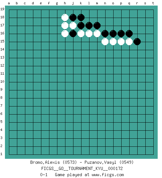 Last move : 0-1 2017 March 14 20:2:34 [Event "FICGS__GO__TOURNAMENT_KYU__000172"] [Site "FICGS"] [Date "2016.12.24"] [Round "1"] [Black "Bromo,Alexis"] [White "Puzanov,Vasyl"] [Result "0-1"] [Rating 1 "0573"] [Rating 2 "0549"] 1.q16 q15 2.r15 p15 3.p16 o15 4.o16 n15 5.n16 m16 6.m17 l16 7.l17 k16 8.k17 j17 9.j18 h18 10.j16 h17 11.k18 h16 0-1 This go game has been lost on time (started : 2016.12.24 11:15:11) Here are the names of the openings (joseki) played in the four corners : Corner q16 : q16 q15 Hoshi (Hwajeom, Seongjeom, Xingwei`) 4-4 Point. The star or hoshi (4-4) point, emphasizing influence at the potential expense of territory. Corner d16 : j17 j18 This joseki is unknown. A weak or weird move has probably been played in this corner. Player White won this Go (weiqi, baduk) game. Follow this game move after move (download)Very few good moves are played. (Pierre Audouard) The obstacle is the path. (Zen proverb)