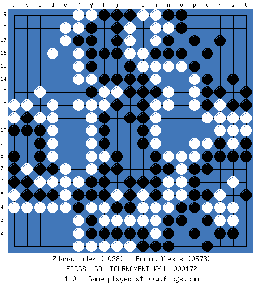 Last move : 1-0 2017 July 17 12:4:48 [Event "FICGS__GO__TOURNAMENT_KYU__000172"] [Site "FICGS"] [Date "2016.12.24"] [Round "1"] [Black "Zdana,Ludek"] [White "Bromo,Alexis"] [Result "1-0"] [Rating 1 "1028"] [Rating 2 "0573"] 1.q16 d4 2.q3 d16 3.r9 d10 4.k4 k16 5.f17 e17 6.h16 f16 7.g17 f18 8.g18 e18 9.h14 g14 10.g15 f15 11.g16 h13 12.j14 j13 13.k14 l15 14.k13 k12 15.l12 m14 16.m16 l16 17.o16 n15 18.n16 o15 19.p15 p14 20.q14 p13 21.q13 p12 22.q12 q11 23.r17 r10 24.q7 p8 25.q8 p9 26.p7 o7 27.p5 o6 28.p6 o5 29.o4 n4 30.o3 m3 31.g3 f3 32.g2 f2 33.f4 e4 34.f5 e5 35.c7 c6 36.c5 c4 37.b6 d6 38.b5 b4 39.d7 e7 40.c9 d9 41.c10 c11 42.b11 b12 43.c12 d11 44.b10 d8 45.c8 c13 46.g13 f14 47.j12 h12 48.k11 f12 49.h11 g12 50.j17 k17 51.j18 k18 52.j16 g11 53.h10 g10 54.h9 g9 55.h6 f6 56.g6 g7 57.h7 h8 58.j8 g8 59.j7 r12 60.r13 s13 61.s12 r11 62.s14 s11 63.t13 s9 64.s8 q9 65.r8 m17 66.n17 n18 67.o18 m18 68.p17 a11 69.a10 a12 70.a8 a5 71.a6 a4 72.d5 e6 73.m7 n8 74.m8 m9 75.l9 m10 76.l10 m11 77.l11 m12 78.m5 n5 79.m6 g4 80.g5 h4 81.j2 j3 82.h2 k3 83.k2 l3 84.l2 m2 85.n2 l5 86.k5 l4 87.l6 j5 88.n3 m4 89.k6 g1 90.m1 h1 91.l1 j1 92.j4 h3 93.h5 f1 94.k19 l19 95.j19 g19 96.m13 n13 97.l14 m15 98.k15 l13 99.t9 s10 100.h19 f19 101.n19 m19 102.o19 b7 103.a7 t11 104.t12 t10 105.t8 k1 106.n1 n6 107.n7 o8 108.pass pass 109.m13 n12 110.l13 r3 111.r4 q2 112.r2 s3 113.p2 q4 114.q1 r5 115.p4 s4 116.s2 s6 117.q5 r4 118.t5 d12 119.pass 1-0 This go game has been lost on time (started : 2016.12.24 11:15:11) Here are the names of the openings (joseki) played in the four corners : Corner d16 : d16 f17 Hoshi (Hwajeom, Seongjeom, Xingwei`) 4-4 Point. The star or hoshi (4-4) point, emphasizing influence at the potential expense of territory. Ikken Kakari (Hankan Keolch'im, Yi Gua`jiao~, 1-Space Low Approach). Black 2 is the standard approach move to the 4-4. Corner q16 : q16 l15 Hoshi (Hwajeom, Seongjeom, Xingwei`) 4-4 Point. The star or hoshi (4-4) point, emphasizing influence at the potential expense of territory. Corner d4 : d4 g3 Hoshi (Hwajeom, Seongjeom, Xingwei`) 4-4 Point. The star or hoshi (4-4) point, emphasizing influence at the potential expense of territory. Niken Kakari (Dukan Keolch'im, E`r Gua`jiao~, 2-Space Low Approach). White typically answers by 7-3 or 3-5 (which is not joseki). Player Black won this Go (weiqi, baduk) game. Follow this game move after move (download)Go uses the most elemental materials and concepts - line and circle, wood and stone, black and white - combining them with simple rules to generate subtle strategies and complex tactics that stagger the imagination. (Iwamoto Kaoru, 9 dan professional Go player and former Honinbo title holder) Live, lose, and learn, by observing your opponent how to win. (Amber Steenbock)