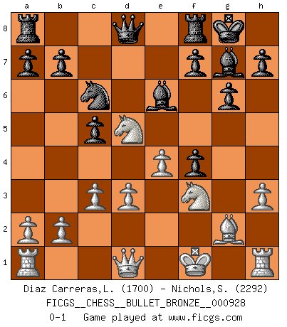 Last move : 0-1 2016 December 25 18:20:41 [Event "FICGS__CHESS__BULLET_BRONZE__000928"] [Site "FICGS"] [Date "2016.12.25"] [Round "1"] [White "Diaz Carreras,Leinier"] [Black "Nichols,Scott"] [Result "0-1"] [WhiteElo "1700"] [BlackElo "2292"] 1.e4 c5 2.Nc3 g6 3.g3 Nc6 4.Bg2 Bg7 5.d3 Nf6 6.Be3 d6 7.h3 O-O 8.f4 e5 9.fxe5 Nh5 10.Bf4 Nxf4 11.gxf4 Qh4+ 12.Kf1 dxe5 13.Nf3 Qd8 14.Nd5 exf4 15.c3 Be6 0-1 This chess game has been lost on time (started : 2016.12.25 17:54:43) Sicilian : Closed Kingside Castling by player Black (move 7) Player Black won this chess game. Follow this game move after move (download)It is difficult to play against Einstein's theory --on his first loss to Fischer. (Mikhail Tal) Es ist nicht das erste mal, dass sich die FIDE dem Arabischen Geld gebeugt hat (über die FIDE WM 2004 in Lybien). (Larry Evans) No existe un remordimiento como el remordimiento del Ajedrez. (H. G. Wells) Les Echecs, c'est l'art de la guerre sans les charniers, c'est la résurrection des morts tombés au champ d'honneur, l'espoir perpétuel, la suprématie de l'intelligence sur la force, la culture de l'esprit. (F. Szpiner) Fame, I have already. Now I need the money. (an elderly Steinitz)