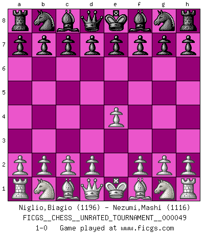 Last move : 1-0 2017 February 5 1:48:39 [Event "FICGS__CHESS__UNRATED_TOURNAMENT__000049"] [Site "FICGS"] [Date "2016.12.26"] [Round "1"] [White "Niglio,Biagio"] [Black "Nezumi,Mashi"] [Result "1-0"] [WhiteElo "1196"] [BlackElo "1116"] 1.e4 1-0 This chess game has been lost on time (started : 2016.12.26 16:37:13) King's pawn Opening Player White won this chess game. Follow this game move after move (download)When the Chess game is over, the Pawn and the King go back to the same box. (Irish saying) Früher wurde jeder komplizierte Zug, jedes interessante Opfer mit großem Beifall und Enthusiasmus aufgenommen. Heute schaltet man einfach seinen Fritz an, und man kann sehen, was los ist, ob der Zug geht oder nicht. (Vladimir Kramnik) Después de una mala apertura, hay una esperanza en el juego medio. Pero una vez que estas en finales, el momento de la verdad ha llegado. (Edmar Mednis) Les erreurs sont comme les malheurs, elles n'arrivent jamais seules. (Siegbert Tarrasch) Treat your password like your toothbrush. Don't let anybody else use it, and get a new one every six months. (Clifford Stoll)