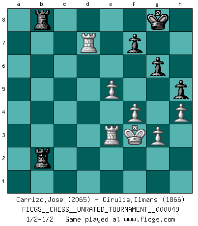 Last move : 1/2-1/2 2017 April 19 18:59:10 [Event "FICGS__CHESS__UNRATED_TOURNAMENT__000049"] [Site "FICGS"] [Date "2016.12.26"] [Round "1"] [White "Carrizo,Jose"] [Black "Cirulis,Ilmars"] [Result "1/2-1/2"] [WhiteElo "2065"] [BlackElo "1866"] 1.e4 e6 2.d4 d5 3.Nc3 Nf6 4.Bg5 Bb4 5.e5 h6 6.Be3 Ne4 7.Qg4 Kf8 8.a3 Bxc3+ 9.bxc3 b6 10.Bd3 Nxc3 11.h4 h5 12.Qf4 Ba6 13.Nf3 Bxd3 14.cxd3 Na4 15.Ng5 Qe7 16.O-O Kg8 17.Rfc1 a6 18.Qg3 Kf8 19.Qf3 Kg8 20.Rc4 b5 21.Rc2 c6 22.Qg3 Kf8 23.Re2 a5 24.Bd2 Qe8 25.Re3 Ra7 26.Rf3 c5 27.dxc5 Nc6 28.Qf4 Kg8 29.Rb1 Nxc5 30.d4 Ne4 31.Nxe4 dxe4 32.Qxe4 Ne7 33.Qd3 b4 34.axb4 axb4 35.Bxb4 g6 36.Bd6 Kg7 37.Bxe7 Qxe7 38.d5 exd5 39.Qd4 Rf8 40.g3 Ra6 41.Rb5 Kg8 42.Rxd5 Qa7 43.Kg2 Qxd4 44.Rxd4 Ra5 45.Re3 Re8 46.f4 Rb5 47.Rd7 Rb2+ 48.Kf3 Reb8 1/2-1/2 French : MacCutcheon, Janowski variation Kingside Castling by player White (move 16) This chess game ended in a draw. Follow this game move after move (download)Life is like a game of Chess, changing with each move. (Chinese proverb) Wenn ich Weiß habe gewinne ich weil ich Weiß habe, wenn ich Schwarz habe gewinne ich weil ich Bogoljubov bin. (Efim Bogoljubov) Fischer es el jugador mas fuerte del mundo. De hecho, el jugador mas fuerte que jamas haya existido. (Larry Evans) Vous m'avez demandé de vous exposer quel est le fondement de la prière. Je ne fais que préparer les pièces du jeu sur la table... Nous sera-t-il permis d'en adopter les règles et si nous les appliquons scrupuleusement nous ne tarderons pas à faire mat le Roi divin ! Il ne pourra échapper à nos mains. (Sainte Thérèse d'Avila, Chemin de perfection) A good teacher is like a candle - it consumes itself to light the way for others. (Author unknown)