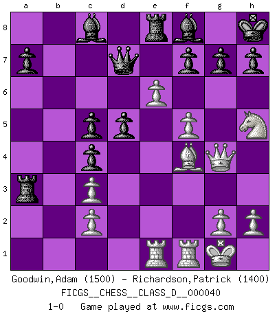 Last move : 1-0 2007 May 6 0:12:36 [Event "FICGS__CHESS__CLASS_D__000040"] [Site "FICGS"] [Date "2007.04.01"] [Round "1"] [White "Goodwin,Adam"] [Black "Richardson,Patrick"] [Result "1-0"] [WhiteElo "1500"] [BlackElo "1400"] 1.e4 e5 2.Nf3 Nc6 3.d4 exd4 4.Bc4 Nf6 5.e5 d5 6.Bb5 Ne4 7.Nxd4 Bd7 8.Bxc6 bxc6 9.O-O Be7 10.f3 Nc5 11.f4 Ne4 12.Nc3 Nxc3 13.bxc3 c5 14.Nb3 c4 15.Nd4 c5 16.Ne2 Bc8 17.Be3 O-O 18.f5 Re8 19.Ng3 Bf8 20.Bf4 Rb8 21.Qg4 Rb6 22.Rad1 Qd7 23.a3 Ra6 24.Rde1 Rxa3 25.Nh5 Kh8 26.e6 1-0 Scotch gambit : Dubois-Reti defense Kingside Castling by player White (move 9) Kingside Castling by player Black (move 17) Player White won this chess game. Follow this game move after move (download)A man that will take back a move at Chess will pick a pocket. (Richard Fenton) Computer sind die einzigen Gegner, die nicht immer eine Ausrede auf Lager haben, wenn sie gegen mich verlieren. (Robert James Fischer) Yo no le temo a Spassky. Todos saben que yo soy el mejor. Uno no necesita un torneo para probarlo. (Bobby Fischer) Echiquier : carré parfait, comme la Jérusalem nouvelle décrite par l'auteur de l'Apocalypse, huit cases sur huit, exaltation du chiffre 4, symbole du cosmos aux quatre horizons... où le noir et le blanc, l'ombre et la lumière, le mal et le bien s'entremêlent et se conjuguent. (Robert Couffignal, Le Gambit du poète) If things go wrong, don't go with them. (Roger Babson)