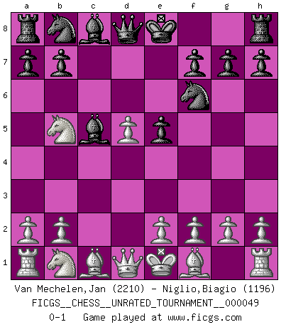 Last move : 0-1 2017 January 1 13:45:5 [Event "FICGS__CHESS__UNRATED_TOURNAMENT__000049"] [Site "FICGS"] [Date "2016.12.26"] [Round "1"] [White "Van Mechelen,Jan"] [Black "Niglio,Biagio"] [Result "0-1"] [WhiteElo "2210"] [BlackElo "1196"] 1.c4 c5 2.Nf3 Nf6 3.d4 cxd4 4.Nxd4 e5 5.Nb5 d5 6.cxd5 Bc5 0-1 English : Symmetrical, Benoni formation Player Black won this chess game. Follow this game move after move (download)When your house is on fire, you can't be bothered with the neighbors. Or, as we say in Chess, if your King is under attack you don't worry about losing a Pawn on the Queen's side. (Gary Kasparov) Fischer ist das größte Genie, das je vom Schachhimmel heruntergestiegen ist. (Mikhail Nekhemyevich Tal) El pensamiento metódico es mas útil en el Ajedrez que la inspiración. (C. J. S. Purdy) Toute estimation doit être constamment réévaluée. (Jacob Estrin) Tree pose grows confidence. It roots me to this world. (Terri Guillemets)