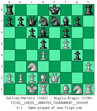 Last move : 0-1 2017 April 1 22:28:0 [Event "FICGS__CHESS__UNRATED_TOURNAMENT__000049"] [Site "FICGS"] [Date "2016.12.26"] [Round "1"] [White "Salinas,Marcelo"] [Black "Niglio,Biagio"] [Result "0-1"] [WhiteElo "1062"] [BlackElo "1196"] 1.e4 c6 2.d4 d5 3.e5 Bf5 4.g4 Bg6 5.Bg5 f6 6.exf6 exf6 7.Bd2 Bd6 8.f4 h5 9.Qe2+ Ne7 10.f5 Bf7 11.Nc3 hxg4 12.O-O-O Nd7 13.h3 Qc7 0-1 This chess game has been lost on time (started : 2016.12.26 16:37:13) Caro-Kann : Advance variation Queenside Castling by player White (move 12) Player Black won this chess game. Follow this game move after move (download)Pawn endings are to Chess what putting is to golf. (Cecil Purdy) Zeige mir drei Eröffnungsvarianten und ich beweise dir, dass zwei davon inkorrekt sind. (Emanuel Lasker) Después de una mala apertura, hay una esperanza en el juego medio. Pero una vez que estas en finales, el momento de la verdad ha llegado. (Edmar Mednis) Des combinaisons [dans le jeu d'échecs] pareilles à des mélodies. Je crois entendre pour ainsi dire la musique des coups... (Vladimir Nabokov) Luck never gives; it only lends. (Swedish proverb)
