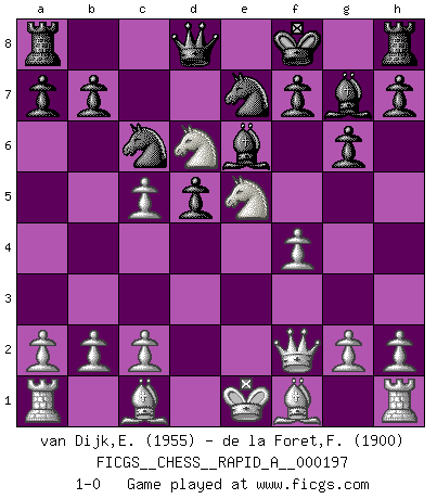 Last move : 1-0 2017 February 25 17:31:55 [Event "FICGS__CHESS__RAPID_A__000197"] [Site "FICGS"] [Date "2016.12.27"] [Round "1"] [White "van Dijk,Erik L."] [Black "de la Foret,Fred"] [Result "1-0"] [WhiteElo "1955"] [BlackElo "1900"] 1.e4 c5 2.Nc3 d6 3.f4 Nc6 4.Nf3 e6 5.d4 d5 6.exd5 exd5 7.Qe2+ Nge7 8.dxc5 g6 9.Nb5 Bg7 10.Nd6+ Kf8 11.Ne5 Be6 12.Qf2 1-0 This chess game has been lost on time (started : 2016.12.27 13:50:50) Sicilian : Closed Player White won this chess game. Follow this game move after move (download)Man is a frivolous, a specious creature, and like a Chess player, cares more for the process of attaining his goal than for the goal itself. (Dostoyevsky) Modernes Schach sorgt sich zuviel um Dinge wie Bauernstruktur usw. Vergessen Sie das, Schachmatt beendet das Spiel! (Nigel Short) Hay jugadores fuertes y personas amables y yo soy un jugador fuerte. (Bobby Fischer) Vous n'êtes pas toujours obligé de jouer le meilleur coup. Un coup doit être actif, entreprenant, correct et beau ! (David Bronstein) Wawaweewa ! (Borat: Cultural learnings of America for make benefit glorious nation of Kazakhstan)