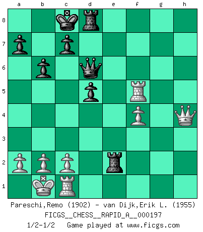 Last move : 1/2-1/2 2017 February 22 11:28:59 [Event "FICGS__CHESS__RAPID_A__000197"] [Site "FICGS"] [Date "2016.12.27"] [Round "1"] [White "Pareschi,Remo"] [Black "van Dijk,Erik L."] [Result "1/2-1/2"] [WhiteElo "1902"] [BlackElo "1955"] 1.d4 f5 2.Bg5 g6 3.Nd2 Bg7 4.e4 fxe4 5.Nxe4 Nh6 6.Qd2 Nf7 7.Nf3 d5 8.Nc3 Nc6 9.O-O-O Bg4 10.h4 Bxf3 11.gxf3 Nxg5 12.Qxg5 e6 13.Qe3 Qd6 14.Bb5 O-O-O 15.Bxc6 Qxc6 16.Ne2 Qa6 17.Kb1 e5 18.dxe5 Bxe5 19.Qxe5 Rhe8 20.Qg7 Rxe2 21.Qxh7 Qc6 22.Rc1 Qf6 23.h5 gxh5 24.Rxh5 Rxf2 25.Rf5 Qd6 26.Qh4 Re2 27.f4 b6 1/2-1/2 Dutch, 2.Bg5 variation Queenside Castling by player White (move 9) Queenside Castling by player Black (move 14) This chess game ended in a draw. Follow this game move after move (download)Fischer is completely natural. He plays no roles. He's like a child. Very, very simple. (Zita Rajcsanyi) Im Schach gewinnt jeder. Hat man Freunde am Spiel - und das ist die Hauptsache - ist auch der Verlust einer Partie kein Unglück. (David Bronstein) Mis oponentes también hacen buenas movidas. A veces yo no tomo esas cosas en consideración. (Bobby Fischer) Karpov est une pièce de musée. (Garry Kasparov) Perception is reality. (Immanuel Kant)