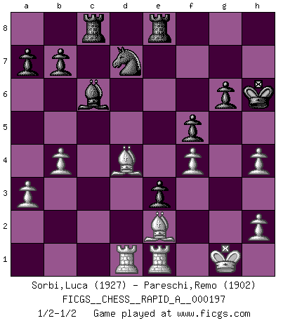 Last move : 1/2-1/2 2017 February 4 22:4:22 [Event "FICGS__CHESS__RAPID_A__000197"] [Site "FICGS"] [Date "2016.12.27"] [Round "1"] [White "Sorbi,Luca"] [Black "Pareschi,Remo"] [Result "1/2-1/2"] [WhiteElo "1927"] [BlackElo "1902"] 1.e4 Nf6 2.e5 Nd5 3.d4 d6 4.Nf3 dxe5 5.Nxe5 c6 6.Be2 Nd7 7.Nf3 g6 8.O-O Bg7 9.c4 Nc7 10.Nc3 O-O 11.Be3 e5 12.d5 f5 13.Bg5 Bf6 14.Bh6 Re8 15.Qc1 e4 16.Ng5 e3 17.f4 cxd5 18.Nxd5 Nxd5 19.cxd5 Nb6 20.Qc5 Bxg5 21.Bxg5 Qxd5 22.Qxd5+ Nxd5 23.Rad1 Nb6 24.Rfe1 Bd7 25.Bf6 Bc6 26.g3 Rac8 27.Bd4 h5 28.a3 Kh7 29.b4 h4 30.gxh4 Kh6 31.Be5 Nd7 32.Bd4 1/2-1/2 Alekhine's defense : Modern, Larsen variation Kingside Castling by player White (move 8) Kingside Castling by player Black (move 10) This chess game ended in a draw. Follow this game move after move (download)Botvinnik tried to take the mystery out of Chess, always relating it to situations in ordinary life. He used to call Chess a typical inexact problem similar to those which people are always having to solve in everyday life. (Garry Kasparov) Du weisst es gibt ein Problem mit Computern und Fernschach, wenn jeder eine Rating von 2450 hat. (John Christen Knudsen) El Ajedrez no es como la vida... ¡tiene reglas!. (Mark Pasternak) Assurément je connaissais par expérience le mystérieux attrait de ce jeu royal, le seul entre tous les jeux inventés par les hommes qui échappe souverainement à la tyrannie du hasard, le seul où l'on ne doive sa victoire qu'à son intelligence ou plutôt à une certaine forme d'intelligence. Mais n'est-ce pas déjà le limiter injurieusement que d'appeler les échecs un jeu ? N'est-ce pas une science, un art ou quelque chose qui, comme le cercueil de Mahomet entre ciel et terre, est suspendu entre l'un et l'autre, et qui réunit un nombre incroyable de contraires ? [...] C'est une pensée qui ne mène à rien, une mathématique qui n'établit rien, un art qui ne laisse pas d'uvre, une architecture sans matière; et il l'a prouvé néanmoins qu'il était plus durable, à sa manière, que les livres ou que tout autre monument, ce jeu unique qui appartient à tous les peuples et à tous les temps, et dont personne ne sait quel dieu en fit don à la terre pour tuer l'ennui, pour aiguiser l'esprit et stimuler l'âme. Où commence-t-il, où finit-il ? (Stefan Zweig) In my experience, there's no such thing as luck. (Obi-Wan Kenobi in Star Wars ep.4)