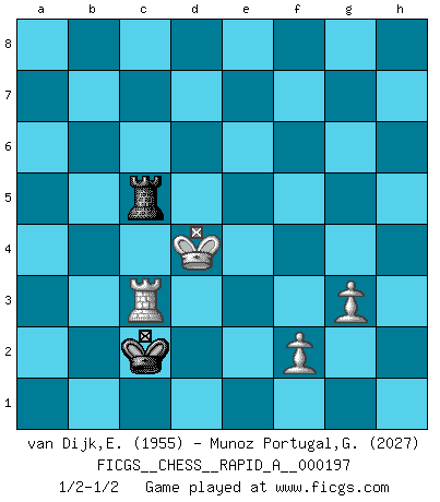 Last move : 1/2-1/2 2017 May 16 5:45:44 [Event "FICGS__CHESS__RAPID_A__000197"] [Site "FICGS"] [Date "2016.12.27"] [Round "1"] [White "van Dijk,Erik L."] [Black "Munoz Portugal,Guillermo"] [Result "1/2-1/2"] [WhiteElo "1955"] [BlackElo "2027"] 1.d4 d5 2.c4 dxc4 3.Nf3 e6 4.Bg5 Nf6 5.Nc3 a6 6.a4 Nc6 7.e3 Na5 8.Ne5 Bb4 9.Bxf6 gxf6 10.Nxc4 c5 11.dxc5 Qxd1 12.Rxd1 Nxc4 13.Bxc4 Bd7 14.Be2 Rc8 15.Bf3 Rc7 16.O-O Ke7 17.Rd4 Bxc3 18.bxc3 Rb8 19.c6 Bxc6 20.Bxc6 Rxc6 21.Rc1 Rb8c8 22.Rb4 Rc8c7 23.Kf1 Kf8 24.c4 b6 25.c5 bxc5 26.Rbc4 f5 27.Ke2 Ke7 28.h3 h5 29.Rb1 Rc8 30.a5 Kf6 31.g3 Ke5 32.Kd3 Rd8 33.Ke2 Rd8c8 34.Kd3 Rd6 35.Ke2 Rc7 36.Rbc1 Rd5 37.Rb1 Rd8 38.Rb6 Rd6 39.Rxd6 Kxd6 40.Rh4 Rb7 41.Rxh5 Rb5 42.Rh8 Kd7 43.h4 Rxa5 44.h5 Ra1 45.Ra8 Kc6 46.Kf3 Rh1 47.Rxa6+ Kb5 48.Ra7 c4 49.Rxf7 Rxh5 50.e4 Kb4 51.Rb7+ Kc3 52.Rb6 Kd4 53.Rxe6 fxe4 54.Rxe4+ Kd3 55.Re3+ Kd2 56.Ke4 Rc5 57.Kd4 c3 58.Rd3+ Kc2 59.Rxc3+ 1/2-1/2 QGA : 3.Nf3 Kingside Castling by player White (move 16) 10 pieces endgame at move 49 : White KRPPP , Black KRPPP WHITE : King + 1 Rook 3 Pawns BLACK : King + 1 Rook 3 Pawns 9 pieces endgame at move 53 : White KRPPP , Black KRPP WHITE : King + 1 Rook 3 Pawns BLACK : King + 1 Rook 2 Pawns 8 pieces endgame at move 53 : White KRPP , Black KRPP WHITE : King + 1 Rook 2 Pawns BLACK : King + 1 Rook 2 Pawns 7 pieces endgame at move 54 : White KRPP , Black KRP WHITE : King + 1 Rook 2 Pawns BLACK : King + 1 Rook 1 Pawn 6 pieces endgame at move 59 : White KRPP , Black KR WHITE : King + 1 Rook 2 Pawns BLACK : King + 1 Rook This chess game ended in a draw. Follow this game move after move (download)He who fears an isolated Queen's Pawn should give up Chess. (Siegbert Tarrasch) Ich habe die Schachforschung dermaßen betrieben, dass sie auf eine wissenschaftliche Basis gestellt wurde. (Mikhail Moiseyevich Botvinik) Del Ajedrez se ha dicho que la vida no es lo suficientemente larga para él, pero eso es culpa de la vida, no del Ajedrez. (William Ewart Napier) L'ordinateur a tué l'originalité. Il n'y a plus guère d'aventures sur l'échiquier. (Jacob Murray) Life is the sum of all your choices. (Albert Camus)
