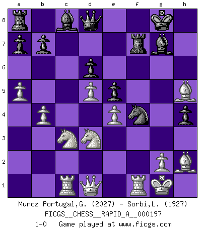 Last move : 1-0 2017 March 21 1:31:22 [Event "FICGS__CHESS__RAPID_A__000197"] [Site "FICGS"] [Date "2016.12.27"] [Round "1"] [White "Munoz Portugal,Guillermo"] [Black "Sorbi,Luca"] [Result "1-0"] [WhiteElo "2027"] [BlackElo "1927"] 1.Nf3 Nf6 2.d4 g6 3.c4 Bg7 4.Nc3 O-O 5.e4 d6 6.Be2 e5 7.O-O Nc6 8.d5 Ne7 9.Ne1 Nd7 10.f3 f5 11.Be3 f4 12.Bf2 g5 13.b4 Nf6 14.Rc1 Ng6 15.c5 Rf7 16.a4 h5 17.a5 g4 18.cxd6 g3 19.hxg3 fxg3 20.Bxg3 cxd6 21.Nd3 h4 22.Bh2 Nh5 23.f4 Ngxf4 24.Bxh5 1-0 Reti Opening Kingside Castling by player Black (move 4) Kingside Castling by player White (move 7) Player White won this chess game. Follow this game move after move (download)The most important feature of the Chess position is the activity of the pieces. This is absolutely fundamental in all phases of the game: Opening, Middlegame and especially Endgame. The primary constraint on a piece's activity is the Pawn structure. (Michael Stean) Kleine Schachspieler machen Mist, und große Schachspieler machen Mist, aber große machen weniger Mist. (Fritz Sämisch) Nada excita más a Grandes Maestros aburridos que una novedad teórica. (Dominic Lawson) Dans le domaine de la peinture, de la gravure et de la sculpture, dès la première décennie de notre siècle, les artistes abandonnent la représentation de la partie d'échecs pour se concentrer sur les pièces, sur les échiquiers et sur toutes les variations auxquelles les unes et les autres peuvent donner lieu. On passe en quelque sorte d'un thème social à un thème musical (au sens de la musica médiévale, c'est-à-dire d'une notion qui inclue le rythme, l'harmonie, la construction et la déconstruction, etc.). Graphiquement et picturalement, l'échiquier apparaît comme une structure ouverte, dynamique, d'une richesse infinie, autorisant toutes les combinatoires et débouchant sur des mouvements et des rythmes de nature exponentielle. (Michel Pastoureau) There are 10 types of people in this world: those who understand binary and those who don't. (Anonymous)