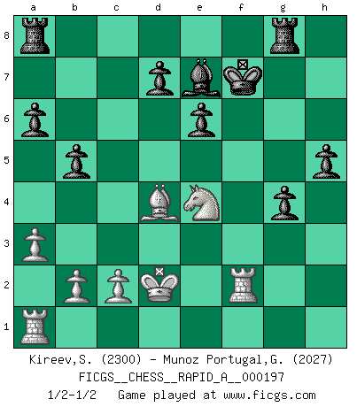 Last move : 1/2-1/2 2017 February 11 0:30:7 [Event "FICGS__CHESS__RAPID_A__000197"] [Site "FICGS"] [Date "2016.12.27"] [Round "1"] [White "Kireev,Sergey"] [Black "Munoz Portugal,Guillermo"] [Result "1/2-1/2"] [WhiteElo "2300"] [BlackElo "2027"] 1.e4 c5 2.Nf3 Nf6 3.e5 Nd5 4.Nc3 e6 5.Ne4 f5 6.Nc3 Ne7 7.d4 cxd4 8.Nxd4 a6 9.f4 b5 10.Be3 Bb7 11.a3 Nbc6 12.Qd2 Nxd4 13.Bxd4 Nc6 14.Be3 Be7 15.Rg1 Qc7 16.g4 Bh4 17.Bf2 Nxe5 18.fxe5 Qxe5 19.Kd1 Bf3 20.Kc1 Qxh2 21.Bd4 Qxd2 22.Kxd2 fxg4 23.Bxg7 Rg8 24.Bd4 h5 25.Bg2 Bxg2 26.Rxg2 Be7 27.Ne4 Kf7 28.Rf2+ 1/2-1/2 Sicilian : Nimzovich-Rubinstein variation This chess game ended in a draw. Follow this game move after move (download)Castle early and often. (Rob Sillars) Ja, jede Frau in Holland liebt mich bestimmt, und alle Männer hassen mich. (Loek van Wely) Puntos débiles o agujeros en la posición de tu oponente deben de ser ocupados por piezas, no Peones. (Siegbert Tarrasch) Les échecs sont plus proches de l'art de l'assassinat que de l'art de la guerre. (Arturo Perez-Reverte) It's not the size of the dog in the fight, it's the size of the fight in the dog. (Mark Twain)