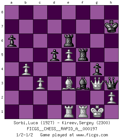 Last move : 1/2-1/2 2017 February 5 16:44:40 [Event "FICGS__CHESS__RAPID_A__000197"] [Site "FICGS"] [Date "2016.12.27"] [Round "1"] [White "Sorbi,Luca"] [Black "Kireev,Sergey"] [Result "1/2-1/2"] [WhiteElo "1927"] [BlackElo "2300"] 1.e4 e5 2.Nf3 Nc6 3.Bb5 a6 4.Ba4 Nf6 5.O-O Be7 6.Re1 b5 7.Bb3 O-O 8.c3 d5 9.exd5 Nxd5 10.Nxe5 Nxe5 11.Rxe5 c6 12.d4 Bd6 13.Re1 Qh4 14.g3 Qh3 15.Be3 Bg4 16.Qd3 Rae8 17.Nd2 Re6 18.a4 bxa4 19.Rxa4 f5 20.Qf1 Qh5 21.f4 Kh8 22.Bxd5 cxd5 23.Qf2 g5 24.R4a1 Rfe8 25.fxg5 f4 26.gxf4 Bh3 27.Kh1 h6 28.Nf3 Bg4 29.Ne5 Bxe5 30.dxe5 Rf8 31.Rf1 hxg5 32.Rae1 Kh7 33.Bd2 Rh6 34.f5 Rxf5 35.Qg3 Bf3+ 36.Kg1 Re6 37.b4 g4 38.Be3 Qh3 39.Bd4 Qh6 40.Be3 Qh3 1/2-1/2 Ruy Lopez : Closed, 7...O-O Kingside Castling by player White (move 5) Kingside Castling by player Black (move 7) This chess game ended in a draw. Follow this game move after move (download)Could we look into the head of a Chess player, we should see there a whole world of feelings, images, ideas, emotion and passion. (Alfred Binet) Schach ist die gewalttätigste aller Sportarten. (Garry Kasparov) El Ajedrez moderno está demasiado preocupado con cosas como la estructura de Peones. Olvidenlo, el Jaque Mate termina la partida. (Nigel Short) Shah mat. Le roi est mort. Cri de fierté d'un joueur venant de terrasser son adversaire, courtoisement, sans effusion de sang. Heh, heh, heh. Time to abandon ship. (General Grievous in Star Wars ep.3)