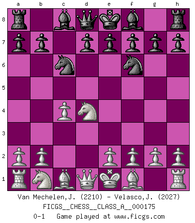 Last move : 0-1 2017 January 2 13:36:26 [Event "FICGS__CHESS__CLASS_A__000175"] [Site "FICGS"] [Date "2016.12.29"] [Round "1"] [White "Van Mechelen,Jan"] [Black "Velasco,Jose Maria"] [Result "0-1"] [WhiteElo "2210"] [BlackElo "2027"] 1.c4 c5 2.Nf3 Nf6 3.d4 cxd4 4.Nxd4 Nc6 0-1 English : Symmetrical, Benoni formation Player Black won this chess game. Follow this game move after move (download)No Chess Grandmaster is normal; they only differ in the extent of their madness. (Viktor Korchnoi) Ich verlor meine Bürgerrechte, mein Gehalt wurde mir nicht mehr bezahlt und ich wurde zensiert und durfte nicht mehr ins Ausland reisen. [nach dem Match Fischer-Taimanov 6:0] (Mark Taimanov) Realmente no sabemos como el juego fue inventado, aunque hay sospechas. Tan pronto como descubramos a los culpables, se los haremos saber. (Bruce Pandolfini) Je menace de comprendre la position. (Anonyme) What doesn't kill us makes us stronger. (Friedrich Nietzsche)