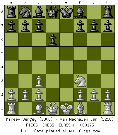 Last move : 1-0 2017 January 1 13:45:11 [Event "FICGS__CHESS__CLASS_A__000175"] [Site "FICGS"] [Date "2016.12.29"] [Round "1"] [White "Kireev,Sergey"] [Black "Van Mechelen,Jan"] [Result "1-0"] [WhiteElo "2300"] [BlackElo "2210"] 1.e4 e5 2.Nf3 Nf6 3.Nxe5 d6 4.Nf3 Nxe4 5.Nc3 Nxc3 6.dxc3 1-0 Petrov : Nimzovich attack Player White won this chess game. Follow this game move after move (download)Not all artists are Chess players, but all Chess players are artists. (Marcel Duchamp) Das Spiel gibt uns die Genugtuung, die das Leben uns versagt. (Emanuel Lasker) Las ideas audaces son como las piezas del Ajedrez que avanzan hacia adelante. Ellas pueden ser vencidas, pero también pueden iniciar una partida victoriosa. (Goethe) Roi des jeux et jeu des rois, les échecs portent en eux un sentiment d'infini. Ils donnent à celui qui s'est efforcé d'en approfondir les arcanes l'impression de n'être pas à la mesure de l'homme; en fait, ils constituent un résumé de l'univers, un microcosme, et figurent cette grande échelle qui, dans les plans de la lumière descend jusqu'à la matière, qui des abîmes insondables remonte jusqu'en l'infini de Dieu. (Pyrame) There are three kinds of lies: lies, damned lies and statistics. (Mark Twain)