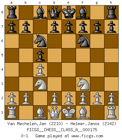 Last move : 0-1 2017 January 1 13:45:18 [Event "FICGS__CHESS__CLASS_A__000175"] [Site "FICGS"] [Date "2016.12.29"] [Round "1"] [White "Van Mechelen,Jan"] [Black "Helmer,Janos"] [Result "0-1"] [WhiteElo "2210"] [BlackElo "2142"] 1.c4 c5 2.Nf3 Nf6 3.Nc3 Nc6 0-1 English : Symmetrical variation Player Black won this chess game. Follow this game move after move (download)The older I grow, the more I value Pawns. (Keres) Es hat in meinem Leben Zeiten gegeben, da ich sehr nahe daran war zu glauben, daß ich auch nicht eine einzige Schachpartie verlieren könnte. (José Raúl Capablanca) ¿Esta Bobby Fischer algo cuerdo?. (Salo Flohr) Le jeu d'échecs est comme rejeté hors du temps. (Antoine de Saint-Exupéry) Life is pain my dear and anyone who says otherwise is selling something. (Princess Bride)